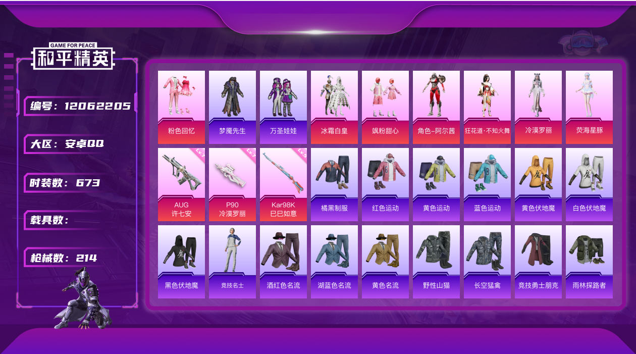 [12062205]7粉装 3特效枪 8印记 可二次 可修改实名 身法装备:Mark.06(新蓝螳螂) 优质装备:粉色回忆,冰霜白皇,狂花道·不知火舞,AUG-许七安,七级AUG-许七安,冷漠罗丽,七级P90-冷漠罗丽,P90-冷漠罗丽,荧海星豚,Kar98K-巳巳如意 热门装扮:飒粉甜心,阿尔茜,万圣娃娃,梦魇先生 五级特效枪:五级Kar98K-巳巳如意 紫色装扮:孙悟空,幻彩翩翩,SS23特训,妙红点点,霓虹热舞,极速光影,SS31特训套装,云朵鹅,彩虹兔,雪绒豹,SS33特训套装,青涩时光,SS21特训,莱茵河畔,白兰地假日,顶瓜瓜,北国孤狼,坚韧舞者,夏日音浪,夜莺强袭者,完美偶像,帅气教官,幻世战舞者,幻影武者,萌趣咩咩,时希公主,灵公主,乐音,SS4特训,SS5特训,人气偶像,娇憨猪猪,闪银刀客,天籁歌者,SS17特训,治愈之星,迅捷之星,科技之星,SS14特训,怪笑疯兔,萌趣颜团子,SS20特训,甜心亚梦,虚音幻奏,猎梦纪元,俏皮奶喵,异彩先驱,缤纷焰火,SS18特训,雪兔飞飞,飞驰魅影,音速流光,SS19特训,军刀雅典娜,战地菁英,黄色名流,飞行日记,魅力单车,鹤鸣,黄色伏地魔,黄色运动,黑色伏地魔,龙的传人,龙腾端午,龟仙人,冰河战士,龙魂突击队,霓虹街区,跃动心情,都市漫游者,酒红色名流,酷萌兔限定,霓虹极客,野性山猫,野性战心,野性战魂,金鼠迎春,长空猛禽,雨林探路者,雪山精英,街头潮人,深蓝色名流,湖蓝色名流,滨海假日,滨海厨神,潮流炫酷,炫蓝之夏,热血青春,燃烧卡路里,牛气冲天,牛气满满,探宝勇士,极地朋克,极速红龙,橘黑制服,竞技达人朋克,红色运动,绮丽涂鸦,荧惑魅影,蓝彩潮人,蓝色运动,竞技勇士朋克,空投萌叽,疯狂小兔子,白熊同盟,白色伏地魔,破晓战魂,破蛋小黄鸡,福星高照,萝兰蝴蝶,狂花道·娜可露露,雏菊兔兔,热情海星,Mark.06(新蓝螳螂),鱼渊荷华,玉兔迎春,燕燕于飞,巳巳如意,智谋强哥,晶辉守护,石蕴玉辉,异域银装,青团波波,糖糖葫芦,竞技名士,临安公主,怀庆长公主,纯真浪花,粉红小猪,神气柴柴,懵萌河马,SS24特训(SS24特训套装),萤火魅影(套装-荧惑魅影),SS25特训,元气发射,焰鹰斗篷,幻羽潜行,蝶吟花词,情公主,小丑鱼,SS7特训,SS8特训,威严将相,玲珑飞花,SS6特训,黑夜传说,SS12特训,韶华初心,小鸟芋圆,娴静芝