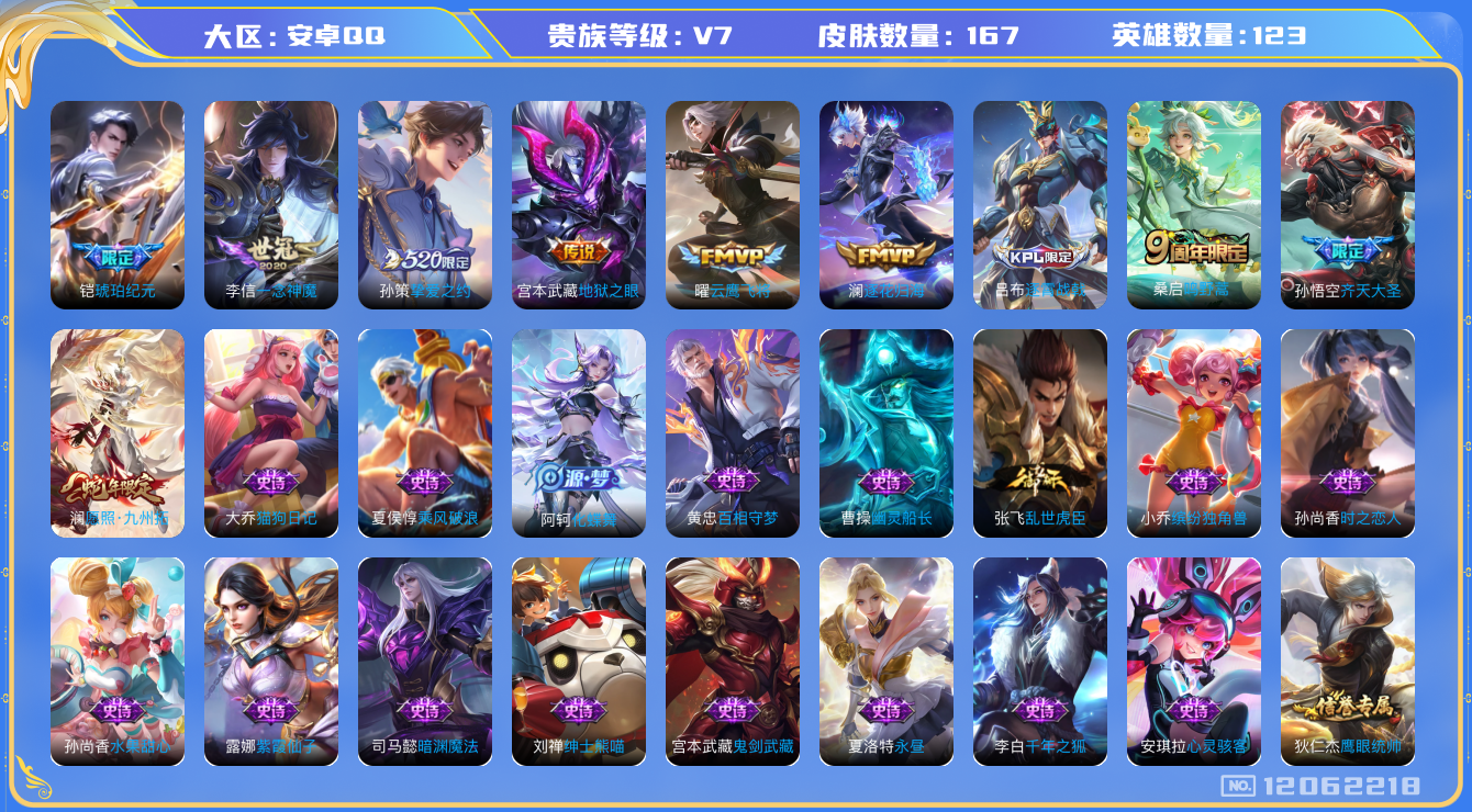 [12062218]V7 9传说 123英雄 167皮肤 可修改实名 优质装备:云鹰飞将(小将军),一念神魔,地狱之眼,挚爱之约,澜逐花归海,琥珀纪元铠 珍宝阁皮:妄想食味 限定皮:愿照·九州拓(澜年限),逐霄战戟,鸣野蒿,齐天大圣 史诗皮:化蝶舞,龙之律动,百相守梦-黄忠,紫霞仙子,千年之狐,永昼,冰冠公主,猫狗日记-大乔,时之恋人-孙尚香,乱世虎臣,女仆咖啡,水果甜心,绅士熊喵,心灵骇客,幽灵船长,鬼剑武藏,暗渊魔法,舞动绿茵,缤纷独角兽,乘风破浪,逐浪之夏,鹰眼统帅,魅力维加斯