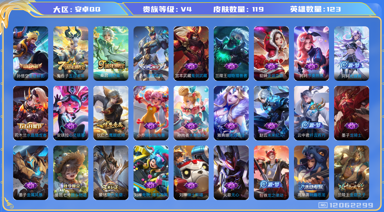 [12062299]V4 1典藏 1传说 123英雄 119皮肤 可修改实名 优质装备:全息碎影(猴子典藏) 珍宝阁皮:玩趣恶龙 限定皮:逐霄战戟,鸣野蒿,五谷丰年 史诗皮:化蝶舞,龙之律动,蔬乡物语(鲁班七号),蒙恬荣光圣徽,冰冠公主,电玩·爆裂旋风,龙骑士(小龙虾),节奏热浪,水果甜心,绅士熊喵,心灵骇客,暗隐猎兽者,鬼剑武藏,纤云弄巧,缤纷独角兽,水晶猎龙者,金属风暴,圣诞恋歌,鹰眼统帅,无心,未来纪元-赵云