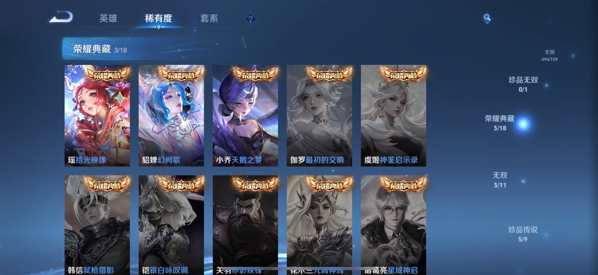 大乔时之奇旅,铠琥珀纪元,孙膑小动物乐团,张飞百相守梦,赵云淬星耀世,小乔音你心动,干将莫邪画中仙,孙尚香乘龙·问璇玑,吕布遇见神鼓,后羿千劫归真,杨玉环星之鸣奏,貂蝉遇见胡旋,裴擒虎祥瑞亨通,夏洛特浮生妄,艾琳觅芳踪,西施游龙清影,西施续相思,嬴政玄雷天君,张良黄金白羊座,曜云鹰飞将,马超无双飞将,澜逐花归海,虞姬云霓雀翎,王昭君永恒水手月亮