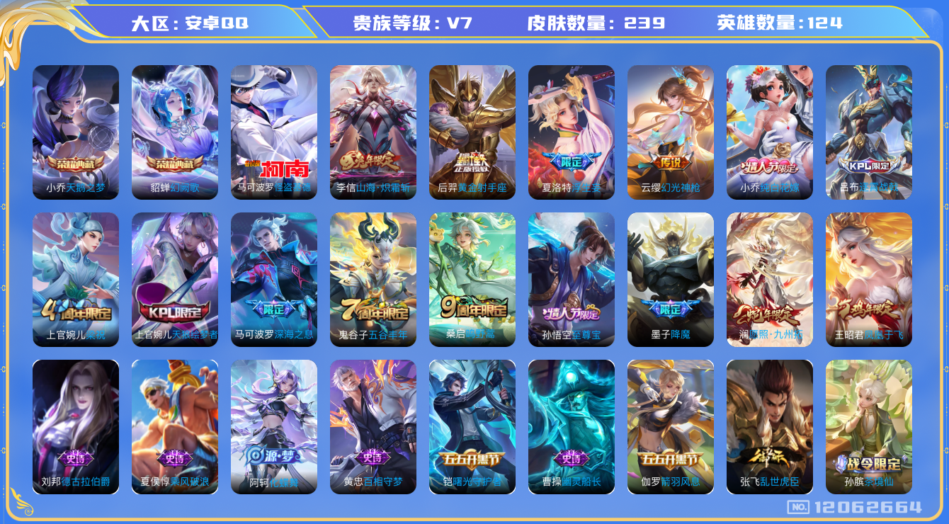 [12062664]V7 2典藏 1珍品传说 7传说 124英雄 239皮肤 可修改实名 优质装备:天鹅之梦(小乔典藏),幻阙歌(貂蝉典藏),怪盗基德,黄金射手座,山海·炽霜斩(李信年限),浮生妄,涂山容容 传说皮:幻光神枪 珍宝阁皮:胡桃夹子,蔷薇恋人 限定皮:愿照·九州拓(澜年限),逐霄战戟,鸣野蒿,至尊宝,凤凰于飞,降魔,五谷丰年,梁祝,天狼绘梦者,纯白花嫁,深海之息(深海大菠萝) 史诗皮:鸭鸭历险记-刘禅,化蝶舞,星界战将,龙之律动,百相守梦-周瑜,茶境仙,蒙犽顽岩魄,百相守梦-百里守约,百相守梦-黄忠,紫霞仙子,电玩小子(小书包),特工魅影,千年之狐,永昼,江河有灵,蒙恬荣光圣徽,冰冠公主,偶像歌手,电玩·爆裂旋风,龙骑士(小龙虾),末日机甲-吕布,猫狗日记-孙策,时之恋人-孙尚香,乱世虎臣,修罗,女仆咖啡,摇滚巨星,水果甜心,星夜王子,心灵骇客,功夫厨神,德古拉伯爵,暗隐猎兽者,幽灵船长,鬼剑武藏,心灵战警,乐园奇幻夜,拒霜思,缤纷独角兽,乘风破浪,逐浪之夏,水晶猎龙者,曙光守护者,箭羽风息,金属风暴,圣诞恋歌,鹰眼统帅,魅力维加斯,黎明之约,无心,未来纪元-赵云