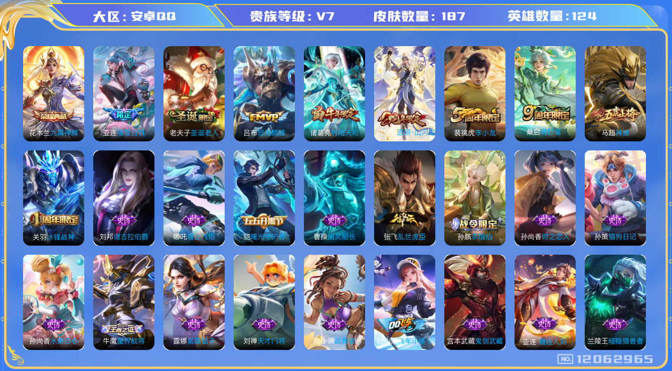 [12062965]V7 1典藏 5传说 124英雄 187皮肤 可修改实名 优质装备:九霄神辉(木兰典藏) 传说皮:落雪白狼 珍宝阁皮:蔷薇恋人 限定皮:愿照·山河定(司空震年限),鸣野蒿,时雨天司(水龙头),神威(电光马子),怒海麟威,冰锋战神,李小龙,圣诞老人 史诗皮:飞车小橘子,糖绘人间,星界战将,茶境仙,破空之剑,战舞者,百相守梦-百里守约,紫霞仙子,特工魅影,千年之狐,百解令(蒙犽),蒙恬荣光圣徽,冰冠公主,偶像歌手,龙骑士(小龙虾),猫狗日记-孙策,时之恋人-孙尚香,乱世虎臣,水果甜心,天才门将,星夜王子,功夫厨神,德古拉伯爵,暗隐猎兽者,幽灵船长,鬼剑武藏,天秀·启明,舞动绿茵,水晶猎龙者,曙光守护者,热力回旋,金属风暴,原初追逐者,圣诞恋歌,鹰眼统帅,黎明之约,雪上飞焰,未来纪元-赵云