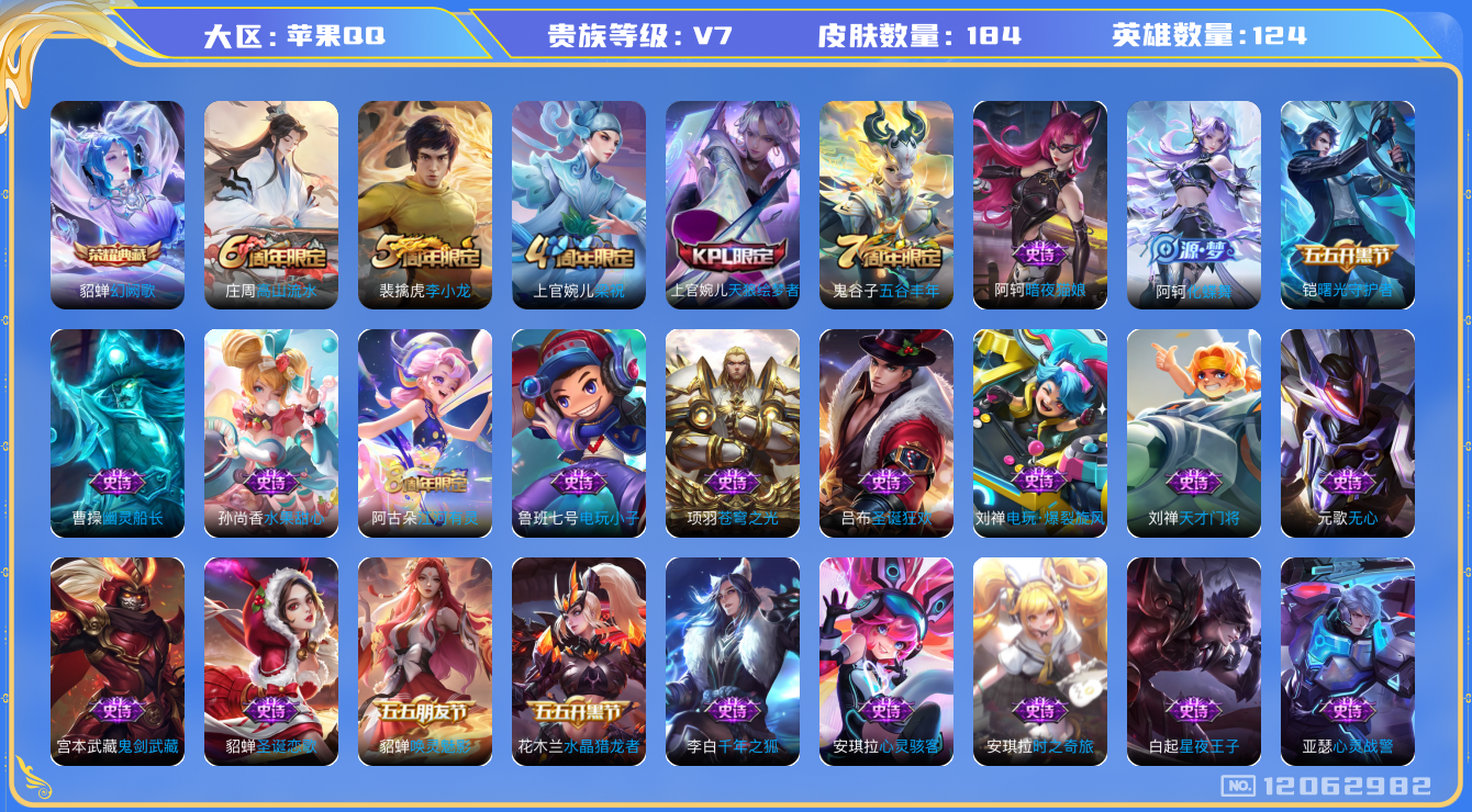 [12062982]V7 1典藏 124英雄 184皮肤 可修改实名 优质装备:幻阙歌(貂蝉典藏) 珍宝阁皮:胡桃夹子,玩趣恶龙 限定皮:高山流水,五谷丰年,梁祝,天狼绘梦者,李小龙 史诗皮:化蝶舞,苍穹之光,电玩小子(小书包),特工魅影,千年之狐,江河有灵,蒙恬荣光圣徽,冰冠公主,偶像歌手,电玩·爆裂旋风,暗夜猫娘,女仆咖啡,摇滚巨星,水果甜心,天才门将,星夜王子,心灵骇客,时之奇旅-安琪拉,功夫厨神,幽灵船长,鬼剑武藏,心灵战警,水晶猎龙者,曙光守护者,唤灵魅影,金属风暴,圣诞狂欢,圣诞恋歌,鹰眼统帅,魅力维加斯,无心,未来纪元-赵云