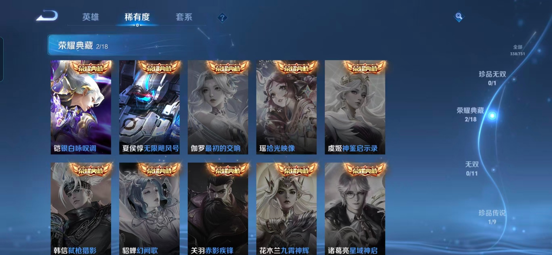- PX_2108131-Q/至尊星耀/309皮肤/123英雄/1典藏/0珍品无双/0无双/2珍品传说/19传说/87史诗/7稀有英雄 【2 珍品传说】酷洛米之心 安琪拉,大耳狗之梦 瑶, 【1 典藏皮肤】幻阙歌 貂蝉, 【19 传说皮肤】星穹之声 王昭君,启明星使 虞姬,无限倾心 虞姬,时之祈愿 瑶,深海之息 马可波罗,游龙清影 西施,燃星之曲 花木兰,仲夏夜之梦 貂蝉,惊梅引 宫本武藏,无限倾心