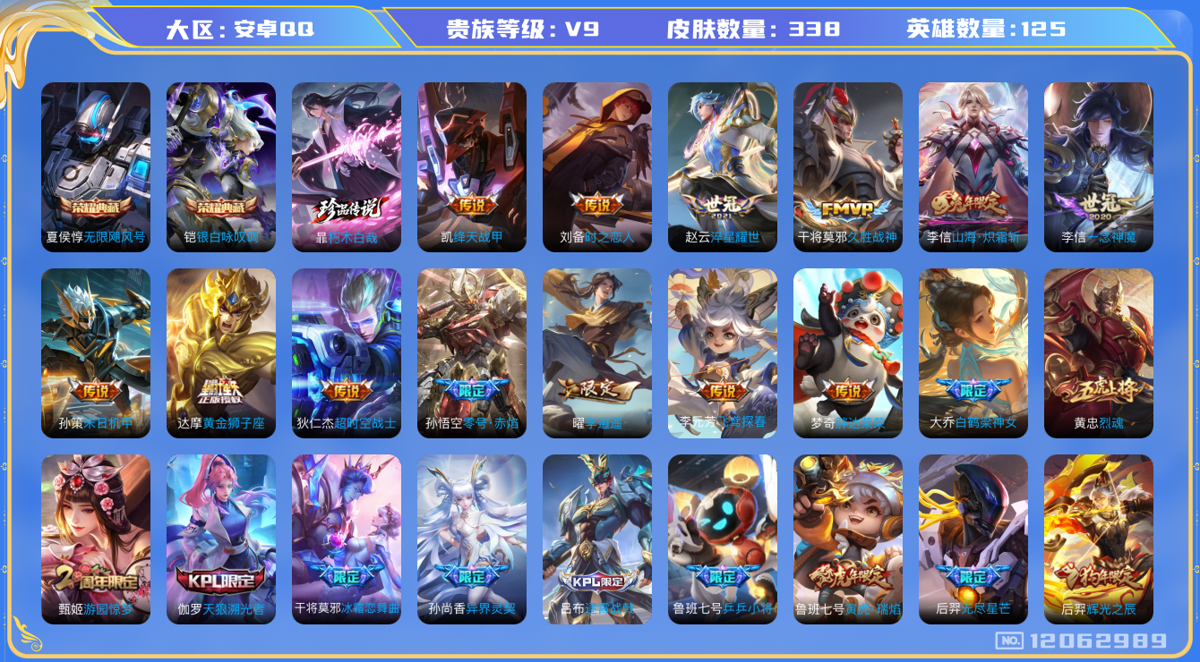 [12062989]V9 2典藏 1珍品传说 22传说 125英雄 338皮肤 可修改实名 优质装备:无限飓风号(高达),银白咏叹调(倪克斯侍卫),朽木白哉,黄金狮子座,绛天战甲(鸡嘴战神),久胜战神,一念神魔,零号·赤焰,飞鸢探春,胖达荣荣,李逍遥,时之恋人-刘备(电焊工),淬星耀世,超时空战士-狄仁杰,末日机甲-孙策,山海·炽霜斩(李信年限) 珍宝阁皮:优雅恋人,女武神 限定皮:愿照·千秋盛(女娲年限),逐霄战戟,鸣野蒿,至尊宝,白虎志(电光耗子),凤凰于飞,异界灵契(白毛香),补天,时之彼端,白鹤梁神女,白晶晶,时雨天司(水龙头),神威(电光马子),高山流水,五谷丰年,冰锋战神,游园惊梦,梁祝,逐梦之星,烈魂,天狼溯光者,李小龙,朱雀志(守约年限),辉光之辰,孙行者,猪悟能,冰霜恋舞曲,乒乒小将,寅虎·瑞焰(虎皮蛋子),无尽星芒 史诗皮:化蝶舞,龙之律动,石田雨龙,琥珀纪元伽罗,蔬乡物语(鲁班七号),乘龙·聚宝船(安琪拉年限),百相守梦-黄忠,紫霞仙子,苍穹之光,电玩小子(小书包),黄金分割率,特工魅影,永昼,江河有灵,闲日渔趣,魅语,百解令(蒙犽),高渐离燃音魔法,无限星赏官,冰冠公主,电玩·爆裂旋风,暗夜猫娘,龙骑士(小龙虾),末日机甲-吕布,猫狗日记-大乔,时之恋人-孙尚香,乱世虎臣,节奏热浪,修罗,女仆咖啡,摇滚巨星,水果甜心,绅士熊喵,天才门将,星夜王子,心灵骇客,时之奇旅-安琪拉,功夫厨神,德古拉伯爵,暗隐猎兽者,幽灵船长,鬼剑武藏,暗渊魔法,心灵战警,乐园奇幻夜,天秀·启明,地狱岩魂,纤云弄巧,繁星吟游(呼啦呼啦),拒霜思,缤纷独角兽,乘风破浪,逐浪之夏,月团寄思,水晶猎龙者,曙光守护者,热力回旋,箭羽风息,金属风暴,原初追逐者,圣诞狂欢,圣诞恋歌,鹰眼统帅,暗夜贵公子,魅力维加斯,黎明之约,赏金猎手,无心,未来纪元-赵云