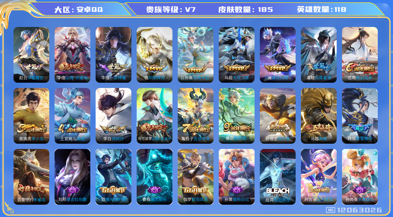 [12063026]V7 10传说 118英雄 185皮肤 可修改实名 优质装备:炽阳神光,一念神魔,云霓雀翎,淬星耀世,无双飞将,山海·炽霜斩(李信年限),澜逐花归海,涂山容容 传说皮:云诺千山 珍宝阁皮:妄想食味,蔷薇恋人,女武神 限定皮:鸣野蒿,傲雪梅枪,神威(电光马子),高山流水,诗剑行,五谷丰年,梁祝,李小龙,朱雀志(守约年限),孙行者,山海·玄木吟(马可年限) 史诗皮:星界战将,谪仙醉月,石田雨龙,百相守梦-百里守约,紫霞仙子,电玩小子(小书包),黄金分割率,特工魅影,千年之狐,永昼,江河有灵,魅语,蒙恬荣光圣徽,无限星赏官,电玩·爆裂旋风,末日机甲-吕布,猫狗日记-孙策,修罗,摇滚巨星,水果甜心,德古拉伯爵,暗隐猎兽者,幽灵船长,鬼剑武藏,暗渊魔法,舞动绿茵,纤云弄巧,拒霜思,逐浪之夏,水晶猎龙者,曙光守护者,箭羽风息,金属风暴,原初追逐者,圣诞狂欢,圣诞恋歌,鹰眼统帅,魅力维加斯,黎明之约,赏金猎手,无心,未来纪元-赵云,玫瑰异探
