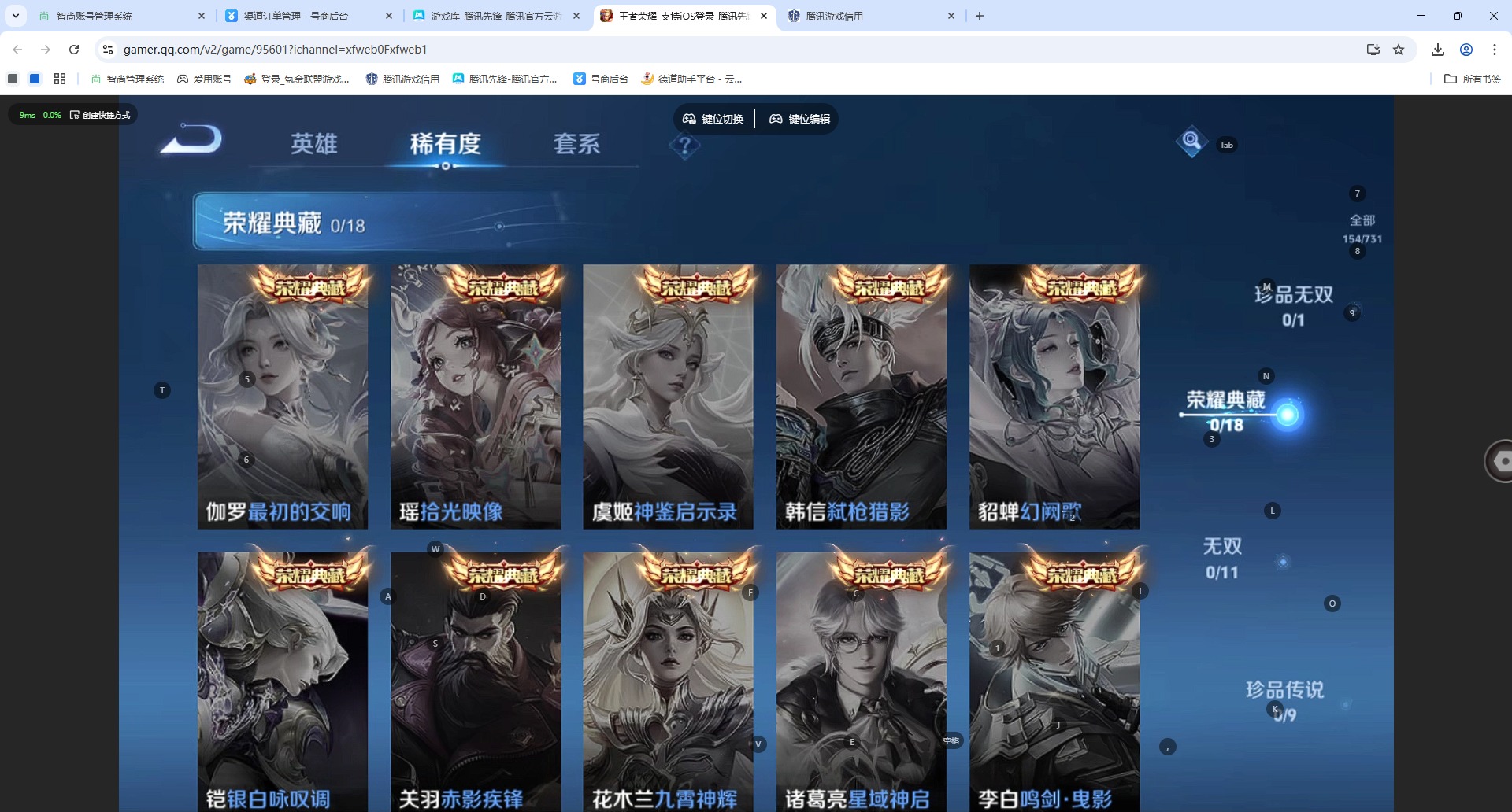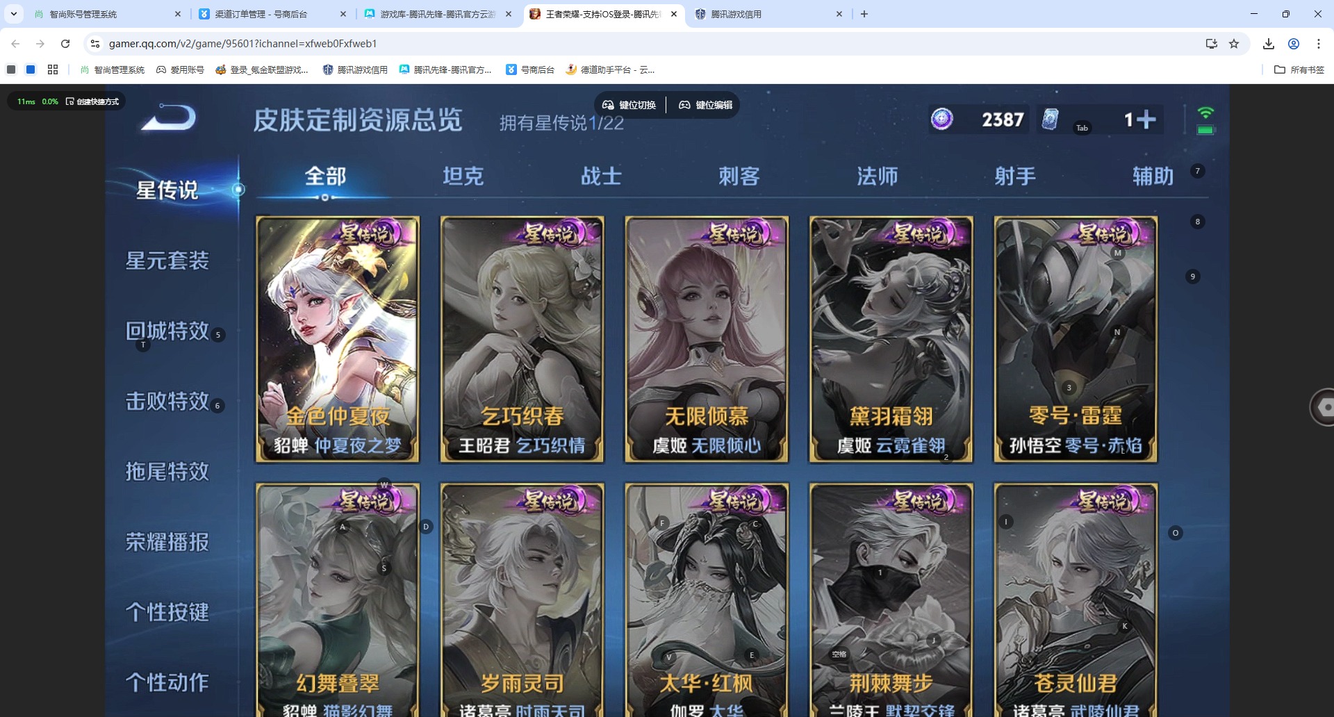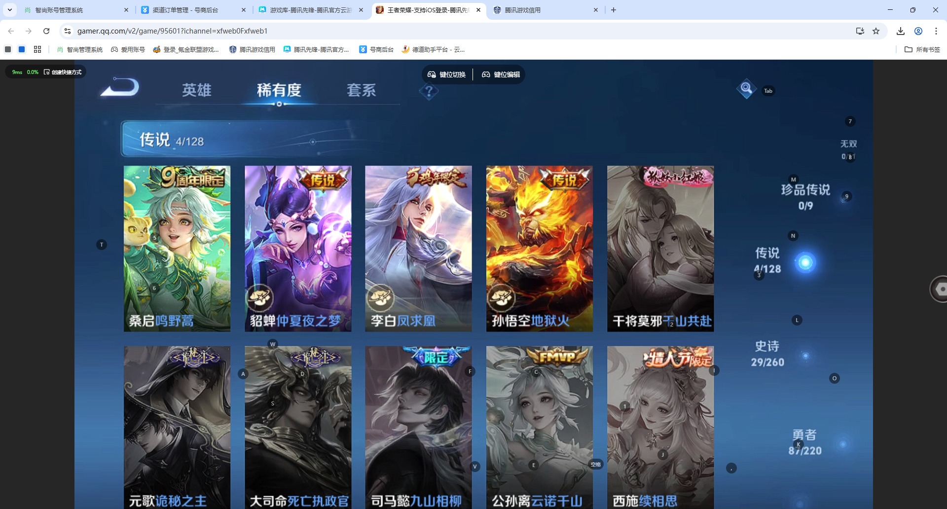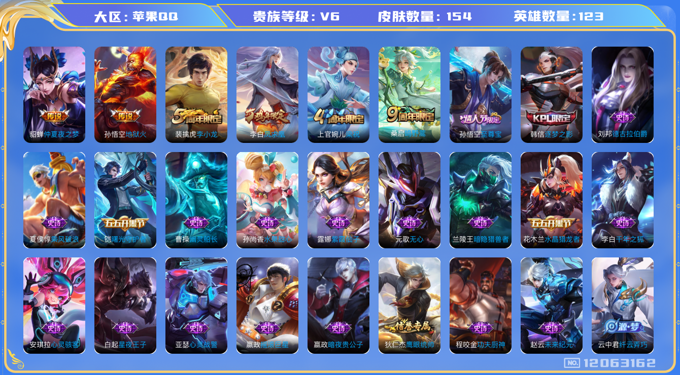 - [12313978]V6 1珍品传说 4传说 125英雄 200皮肤 可修改实名 优质装备:朽木白哉,云鹰飞将(小将军),久胜战神,涂山容容 传说皮:云诺千山 珍宝阁皮:胡桃夹子,蔷薇恋人 限定皮:逐霄战戟,鸣野蒿,五谷丰年,梁祝,默契交锋-花木兰 史诗皮:化蝶舞,龙之律动,藏狐·褐绒,茶境仙,石田雨龙,蒙犽顽岩魄,埋骨钱,百相守梦-黄忠,织梦人,特工魅影,永昼,江河有灵,魅语,冰冠公主,偶像歌手,电玩·爆裂旋风,暗夜猫娘,末日机甲-吕布,乱世虎臣,节奏热浪,修罗,女仆咖啡,水果甜心,绅士熊喵,心灵骇客,功夫厨神,德古拉伯爵,暗隐猎兽者,鬼剑武藏,暗渊魔法,地狱岩魂,纤云弄巧,乘风破浪,水晶猎龙者,曙光守护者,箭羽风息,金属风暴,鹰眼统帅,暗夜贵公子,魅力维加斯,赏金猎手,无心,未来纪元-赵云