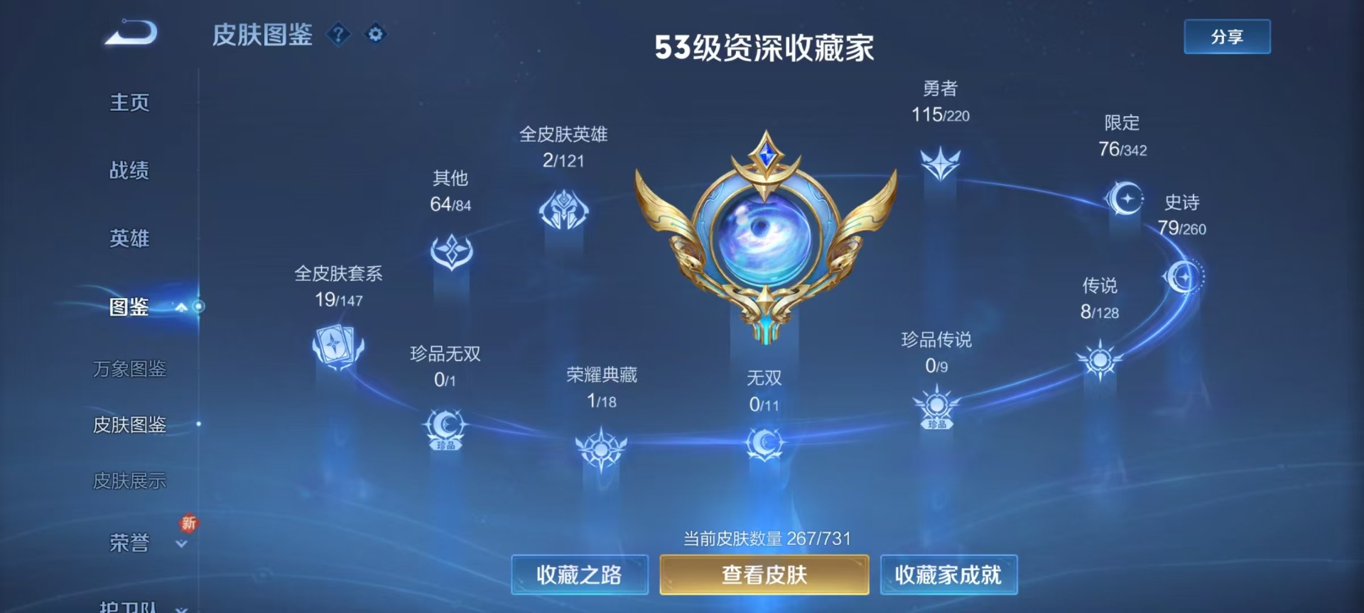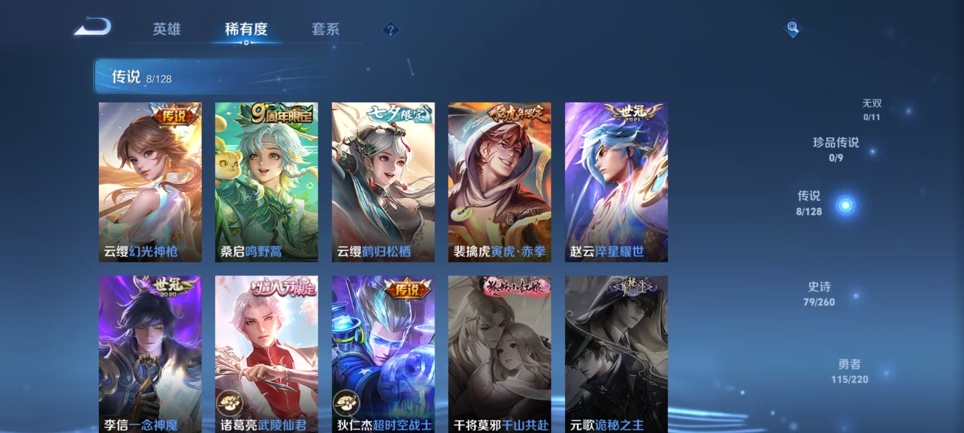 - PX_2090023-贵族等级: V6 英雄数: 124 皮肤数: 131 传说皮: 云鹰飞将,黄金白羊座,祥瑞亨通 限定皮: 高山流水,鸣野蒿,陌上桑,逐霄战戟,愿照·千秋盛,愿照·山河定,愿照·九州拓