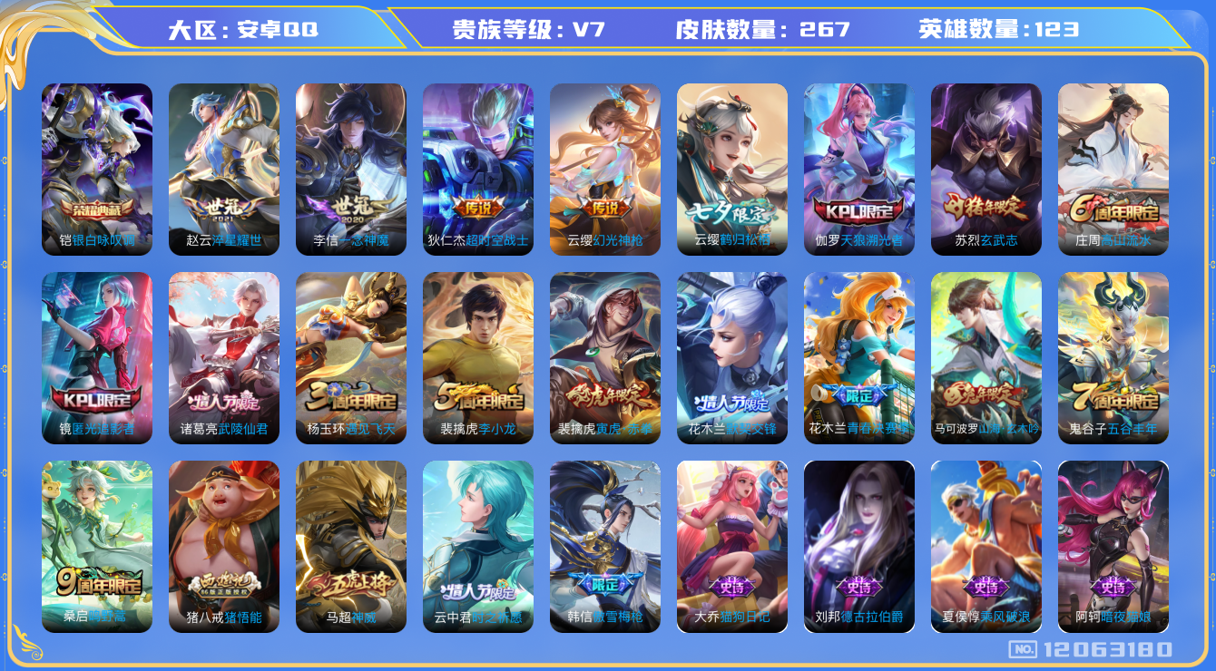 [12063180]V7 1典藏 8传说 123英雄 267皮肤 可修改实名 优质装备:银白咏叹调(倪克斯侍卫),一念神魔,淬星耀世,超时空战士-狄仁杰,鹤归松栖(云缨) 传说皮:幻光神枪 珍宝阁皮:妄想食味,优雅恋人,女武神 限定皮:鸣野蒿,武陵仙君(小桃花),傲雪梅枪,神威(电光马子),遇见飞天,高山流水,五谷丰年,天狼溯光者,李小龙,玄武志(苏烈年限),默契交锋-花木兰,猪悟能,青春决赛季,匿光追影者,寅虎·赤拳(老虎年限),时之祈愿-云中君,山海·玄木吟(马可年限) 史诗皮:紫霞仙子,电玩小子(小书包),白龙吟,黄金分割率,永昼,江河有灵,百解令(蒙犽),蒙恬荣光圣徽,冰冠公主,晚萤,电玩·爆裂旋风,暗夜猫娘,龙骑士(小龙虾),末日机甲-吕布,猫狗日记-孙策,猫狗日记-大乔,时之恋人-孙尚香,乱世虎臣,节奏热浪,修罗,女仆咖啡,水果甜心,绅士熊喵,天才门将,星夜王子,心灵骇客,功夫厨神,德古拉伯爵,暗隐猎兽者,幽灵船长,鬼剑武藏,心灵战警,地狱岩魂,纤云弄巧,拒霜思,缤纷独角兽,乘风破浪,逐浪之夏,水晶猎龙者,热力回旋,金属风暴,原初追逐者,圣诞狂欢,圣诞恋歌,鹰眼统帅,魅力维加斯,黎明之约,赏金猎手,无心,未来纪元-赵云