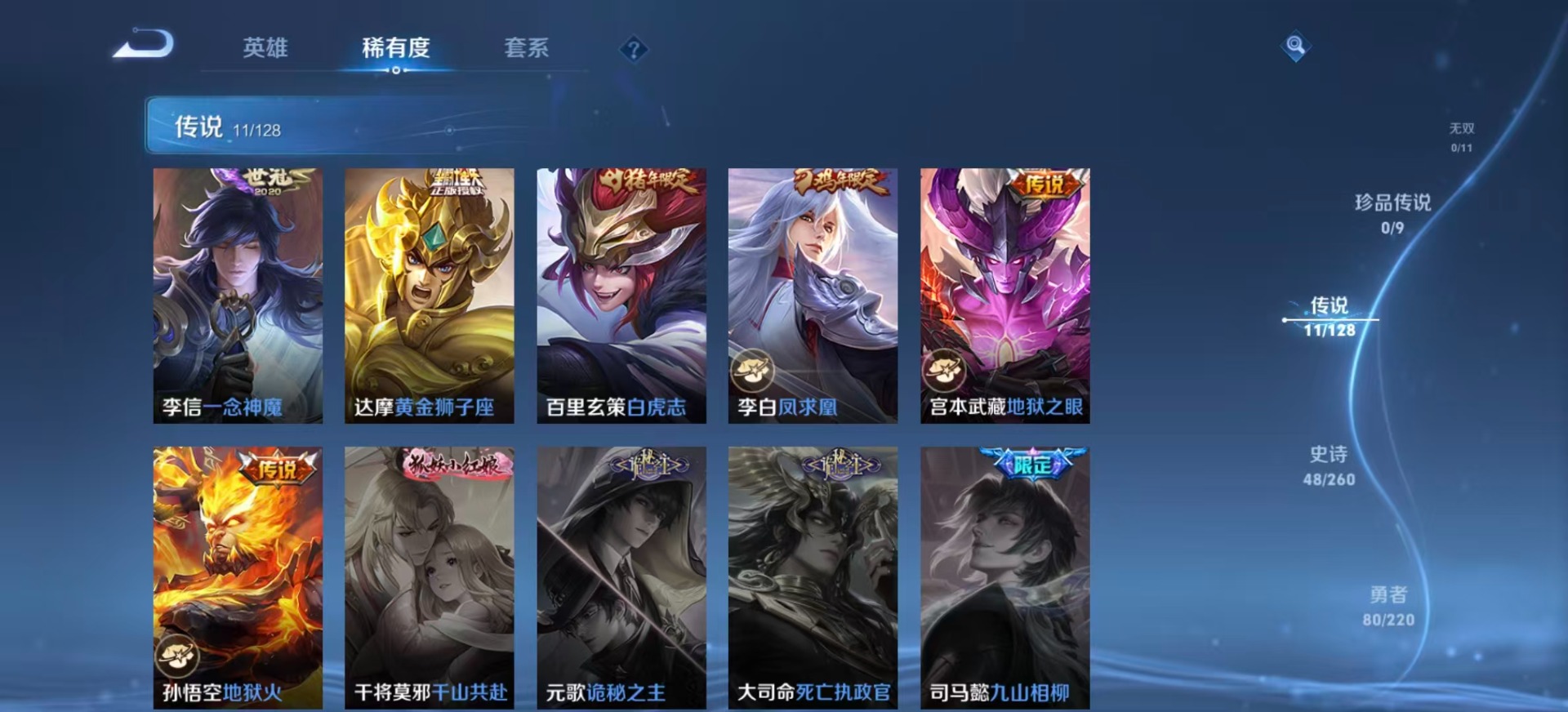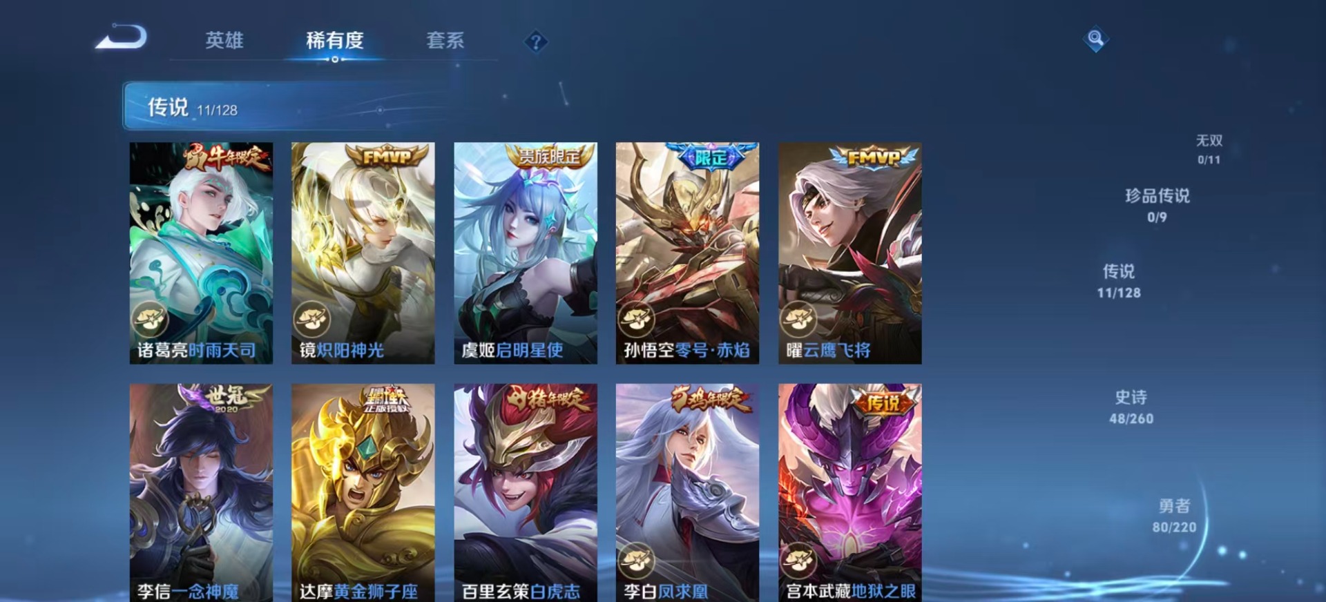 - PX_2104868-Q/最强王者/168皮肤/123英雄/0典藏/0珍品无双/0无双/0珍品传说/6传说/48史诗/7稀有英雄 【6 传说皮肤】李逍遥 曜,齐天大圣 孙悟空,武陵仙君 诸葛亮,炽阳神光 镜,一念神魔 李信,妄想实况 马可波罗, 【48 史诗皮肤】奔雷神使 牛魔,末日机甲 吕布,百解令 蒙犽,高山流水 庄周,匿光追影者 镜,奇遇舞章 艾琳,唐三藏 金蝉,暗影游猎 马可波罗,冰霜恋