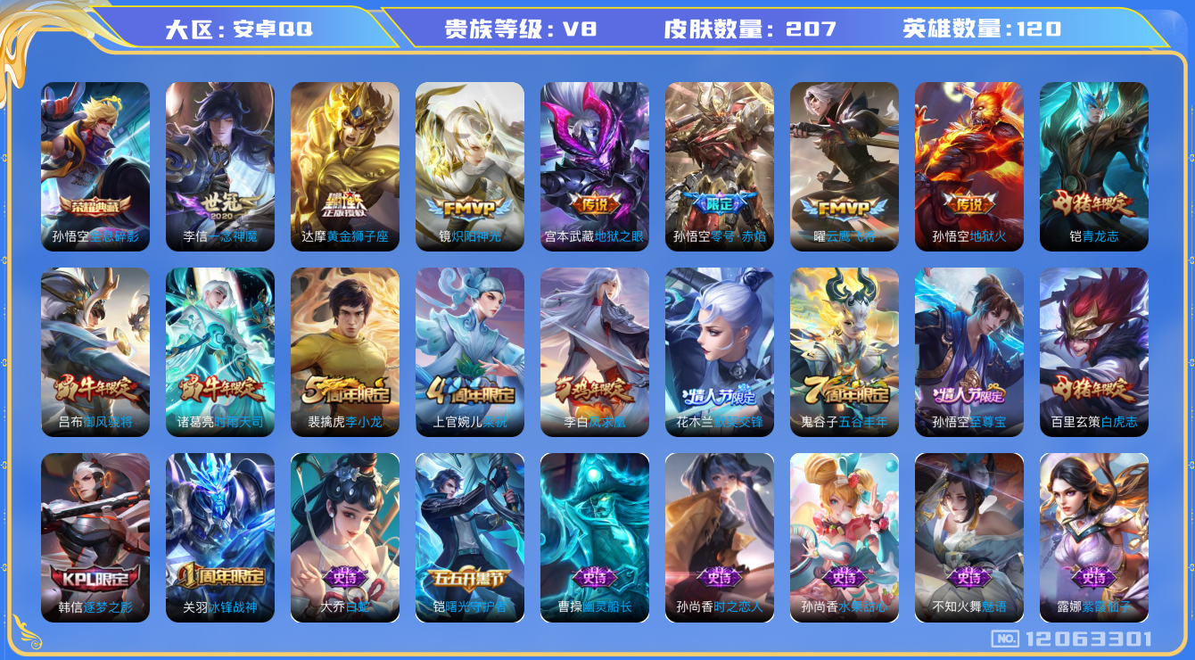 [12063301]V8 1典藏 11传说 120英雄 207皮肤 可修改实名 优质装备:全息碎影(猴子典藏),黄金狮子座,云鹰飞将(小将军),炽阳神光,一念神魔,地狱火,零号·赤焰,地狱之眼 珍宝阁皮:蔷薇恋人 限定皮:至尊宝,白虎志(电光耗子),凤求凰(白切鸡),时雨天司(水龙头),五谷丰年,青龙志(铠年限),冰锋战神,梁祝,御风骁将(吕布年限),李小龙,逐梦之影,默契交锋-花木兰 史诗皮:紫霞仙子,白龙吟,黄金分割率,千年之狐,魅语,冰冠公主,偶像歌手,白蛇,龙骑士(小龙虾),时之恋人-孙尚香,修罗,女仆咖啡,水果甜心,星夜王子,心灵骇客,暗隐猎兽者,幽灵船长,鬼剑武藏,纤云弄巧,繁星吟游(呼啦呼啦),逐浪之夏,曙光守护者,金属风暴,鹰眼统帅,魅力维加斯,未来纪元-赵云