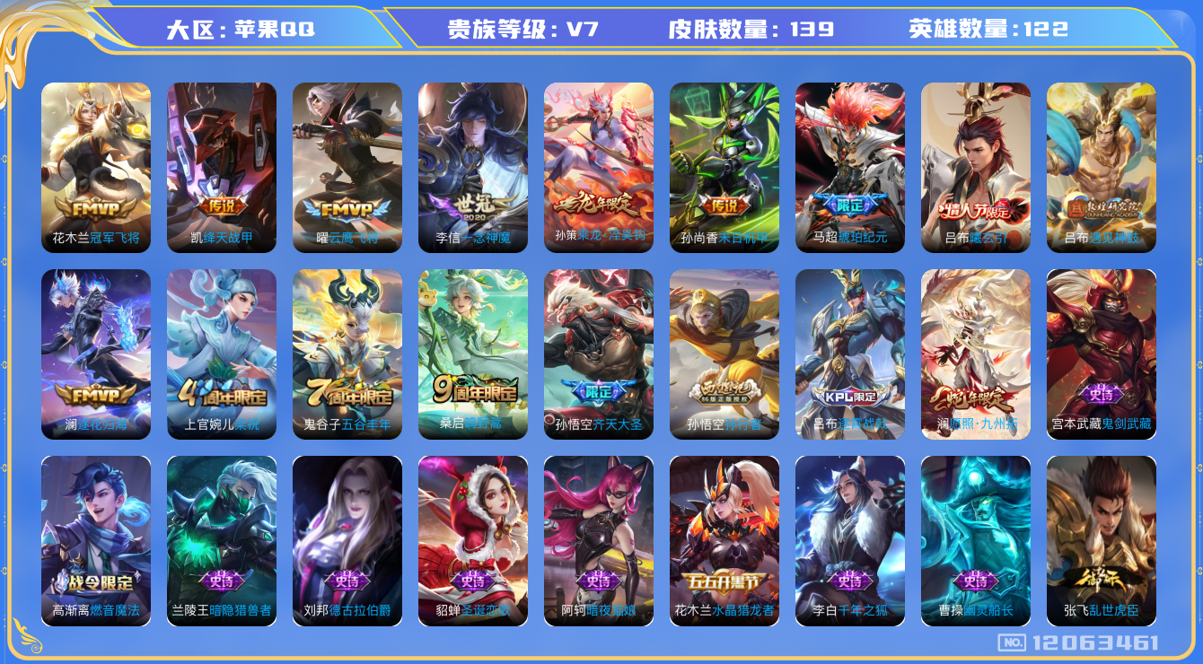 [12063461]V7 13传说 122英雄 139皮肤 可修改实名 优质装备:冠军飞将,云鹰飞将(小将军),绛天战甲(鸡嘴战神),一念神魔,末日机甲-孙尚香(绿蚂蚱),遇见神鼓,澜逐花归海,琥珀纪元马超 传说皮:乘龙·淬吴钩(孙策年限),吕布曦玄引 珍宝阁皮:妄想食味 限定皮:愿照·九州拓(澜年限),逐霄战戟,鸣野蒿,齐天大圣,五谷丰年,梁祝,孙行者 史诗皮:战舞者,紫霞仙子,千年之狐,高渐离燃音魔法,暗夜猫娘,末日机甲-吕布,乱世虎臣,摇滚巨星,水果甜心,功夫厨神,德古拉伯爵,暗隐猎兽者,幽灵船长,鬼剑武藏,缤纷独角兽,逐浪之夏,水晶猎龙者,金属风暴,圣诞恋歌,鹰眼统帅,魅力维加斯,无心,未来纪元-赵云