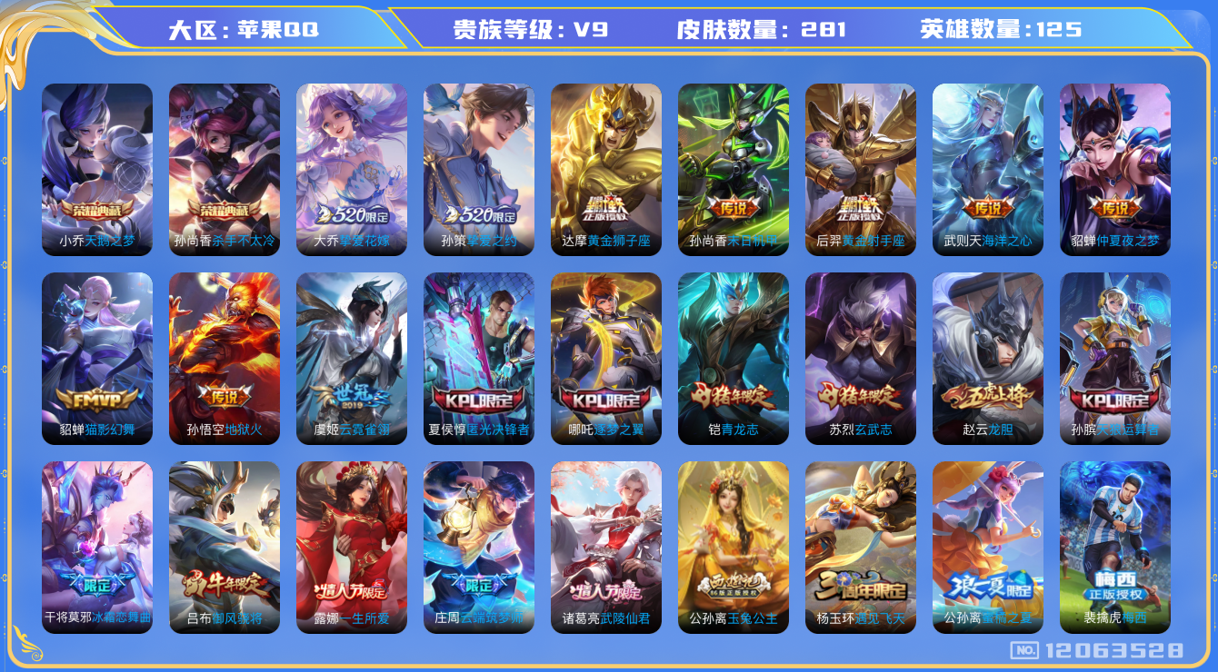 [12063528]V9 2典藏 14传说 125英雄 281皮肤 典藏英雄武则天 可修改实名 优质装备:天鹅之梦(小乔典藏),杀手不太冷,黄金狮子座,黄金射手座,猫影幻舞,云霓雀翎,末日机甲-孙尚香(绿蚂蚱),地狱火,仲夏夜之梦(大飞蛾),海洋之心,挚爱之约,挚爱花嫁,涂山容容 珍宝阁皮:蔷薇恋人 限定皮:至尊宝,白虎志(电光耗子),梅西,武陵仙君(小桃花),补天,白晶晶,飞衡(韩信年限),瑞麟志(木兰年限),遇见飞天,匿光决锋者,青龙志(铠年限),天狼运算者,梁祝,御风骁将(吕布年限),天狼狩猎者,龙胆,逐梦之翼,天狼绘梦者,李小龙,逐梦之光,玄武志(苏烈年限),朱雀志(守约年限),奇迹圣诞,默契交锋-花木兰,一生所爱,大圣娶亲,青春决赛季,冰霜恋舞曲,云端筑梦师,蜜橘之夏,热情桑巴,神奇女侠,玉兔公主 史诗皮:遇见神鹿,紫霞仙子,电玩小子(小书包),黄金分割率,特工魅影,永昼,魅语,无限星赏官,冰冠公主,偶像歌手,晚萤,暗夜猫娘,猫狗日记-孙策,猫狗日记-大乔,乱世虎臣,节奏热浪,修罗,女仆咖啡,水果甜心,绅士熊喵,天才门将,星夜王子,心灵骇客,功夫厨神,德古拉伯爵,暗隐猎兽者,鬼剑武藏,天秀·启明,舞动绿茵,诗语江南,纤云弄巧,繁星吟游(呼啦呼啦),缤纷独角兽,乘风破浪,逐浪之夏,水晶猎龙者,曙光守护者,箭羽风息,唤灵魅影,圣诞狂欢,圣诞恋歌,鹰眼统帅,暗夜贵公子,魅力维加斯,奇遇舞章,未来纪元-赵云
