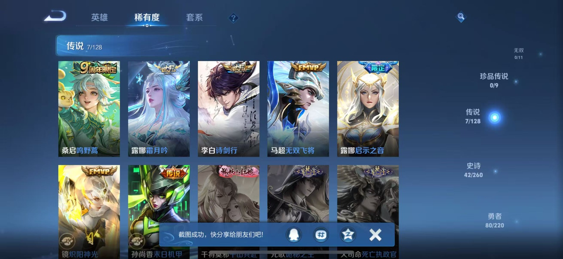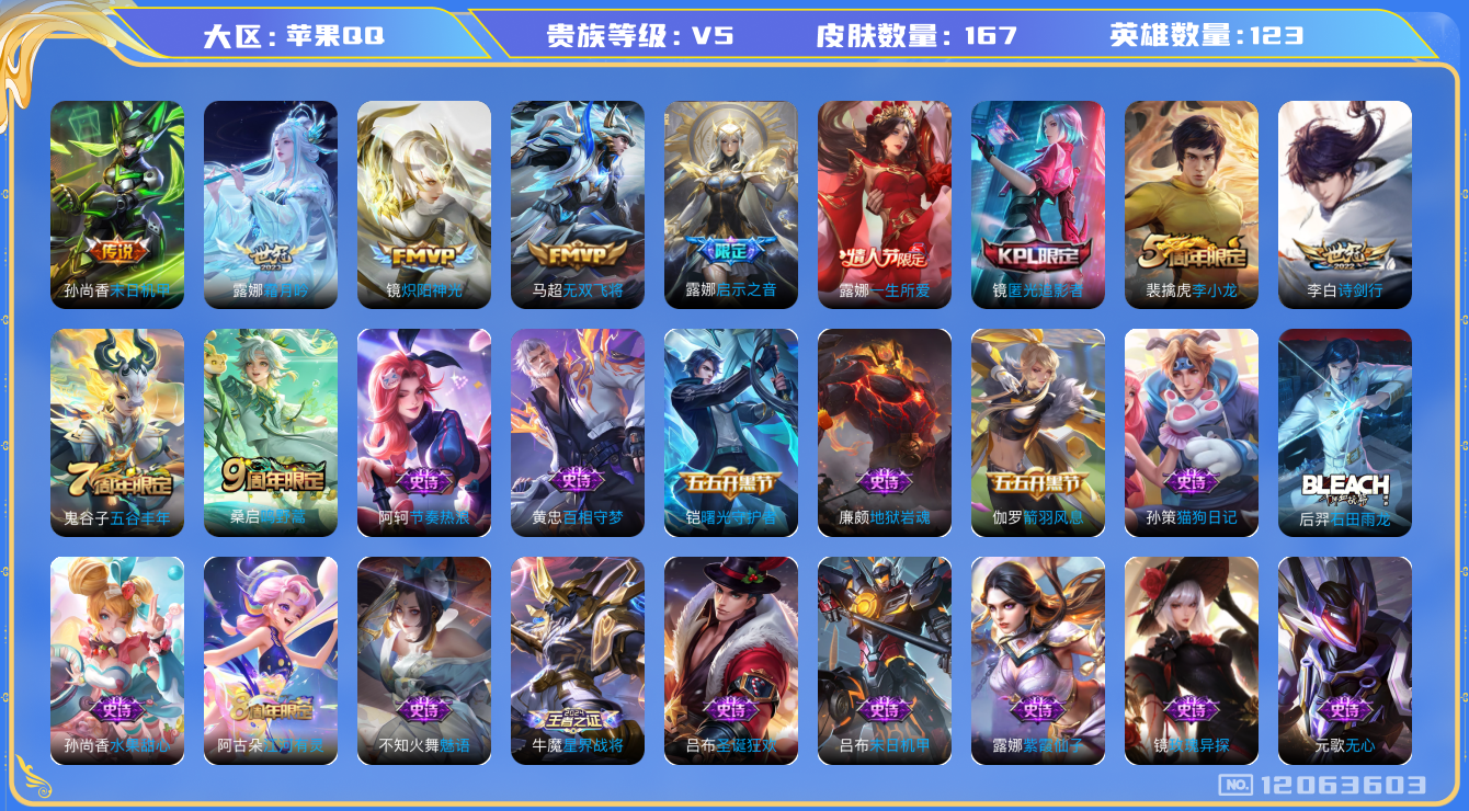 - [12254738]V7 9传说 123英雄 243皮肤 可修改实名 优质装备:炽阳神光,地狱火,地狱之眼,无双飞将,山海·炽霜斩(李信年限),记忆之芯(机甲兔),琥珀纪元马超 珍宝阁皮:妄想食味,优雅恋人,女武神 限定皮:至尊宝,白晶晶,时雨天司(水龙头),神威(电光马子),飞衡(韩信年限),遇见飞天,高山流水,五谷丰年,游园惊梦,梁祝,岱宗(典韦年限),李小龙,冰霜恋舞曲,寅虎·赤拳(老虎年限) 史诗皮:星界战将,紫霞仙子,黄金分割率,特工魅影,千年之狐,江河有灵,百解令(蒙犽),高渐离燃音魔法,蒙恬荣光圣徽,魅语,电玩·爆裂旋风,无限星赏官,末日机甲-吕布,猫狗日记-孙策,乱世虎臣,节奏热浪,修罗,女仆咖啡,摇滚巨星,水果甜心,天才门将,星夜王子,心灵骇客,德古拉伯爵,暗隐猎兽者,幽灵船长,鬼剑武藏,心灵战警,地狱岩魂,纤云弄巧,繁星吟游(呼啦呼啦),拒霜思,缤纷独角兽,乘风破浪,逐浪之夏,水晶猎龙者,金属风暴,原初追逐者,圣诞狂欢,圣诞恋歌,鹰眼统帅,魅力维加斯,黎明之约,无心,未来纪元-赵云