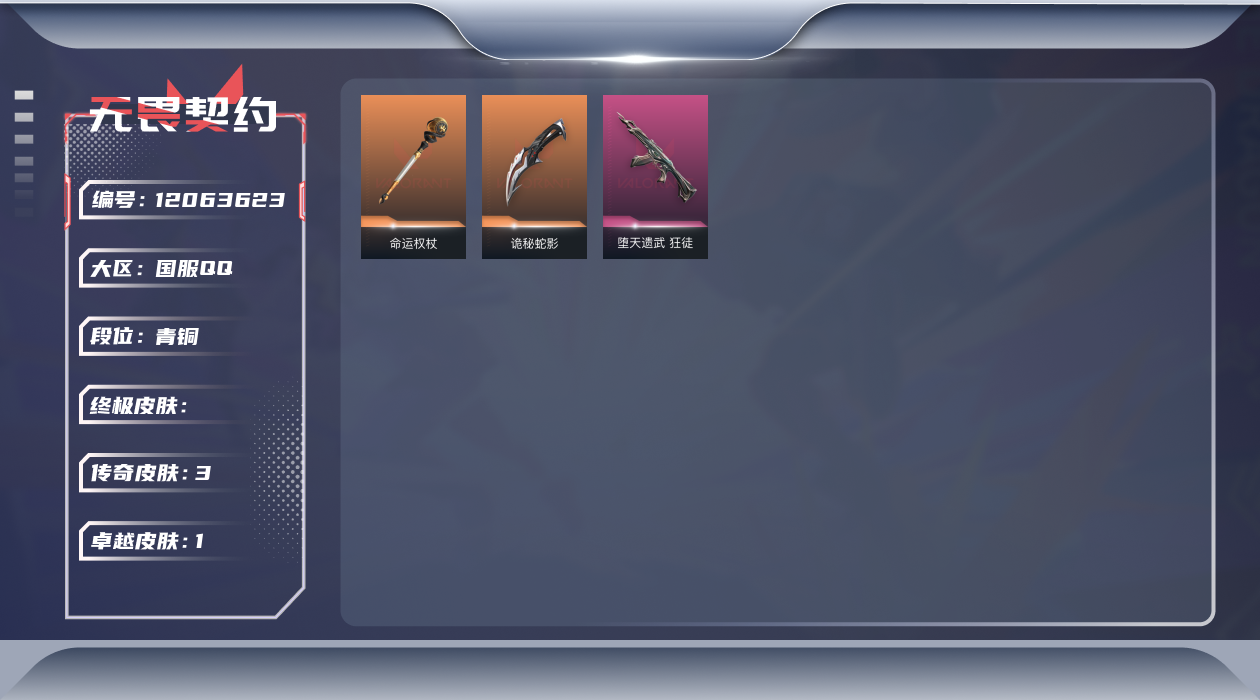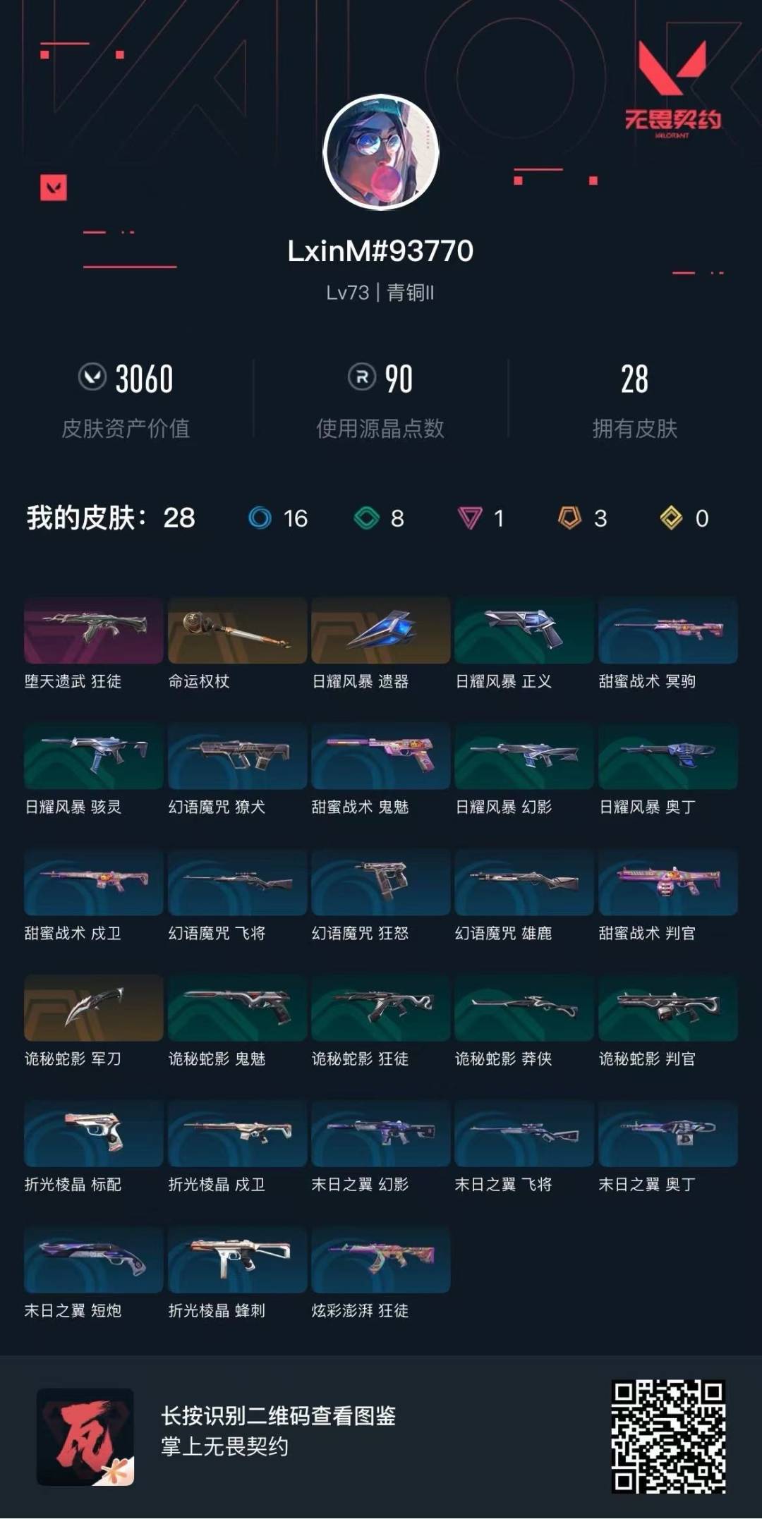 [12063623]3橙皮 1紫皮 28皮肤 21英雄 45卡面 90已用源晶 青铜 优质装备:命运权杖,诡秘蛇影 步枪皮肤:狂徒-堕天遗武