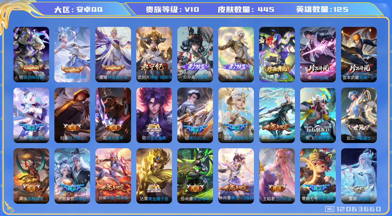 [12063660]V10 3典藏 3无双 3珍品传说 65传说 125英雄 445皮肤 可修改实名 优质装备:银白咏叹调(倪克斯侍卫),神器·明辉仪,碎月剑心(李白无双),神鉴启示录,离恨烟(公孙离无双),最初的交响(伽罗典藏),朽木白哉,黑崎一护,黄金狮子座,黄金射手座,云鹰飞将(小将军),绛天战甲(鸡嘴战神),黄金白羊座,猫影幻舞,末日机甲-孙尚香(绿蚂蚱),地狱之眼,胖达荣荣,乞巧织情,时之恋人-刘备(电焊工),游龙清影(小青龙),淬星耀世,碎云,天秀幻梦,神器·明辉仪,炽翼辉光(娃娃菜牛角包),画中仙,浮生妄,记忆之芯(机甲兔),百相守梦(张飞),灼幽烈阳,鹤归松栖(云缨),遇见神鼓,鲁班七号-时之奇旅,大乔-时之奇旅,永恒水手月亮,夜礼服假面,霜月吟,澜逐花归海,艾琳觅芳踪,琥珀纪元铠,琥珀纪元马超,黄金天蝎座,朵莉亚心动手记,牧神诗旅,玄雷天君,涂山容容 珍品传说:时之奇旅-孙策 传说皮:乘龙·问璇玑(孙尚香年限),乘龙·铭钟鼎(赵云年限),乘龙·淬吴钩(孙策年限),貂蝉曦玄引,吕布曦玄引,典韦战鼓燎原,落雪白狼,铠冥王哈迪斯,续相思,星之鸣奏,祥瑞亨通,幻光神枪 珍宝阁皮:万物之道,蔷薇恋人 限定皮:愿照·九州拓(澜年限),愿照·福禄聚(蔡文姬年限),愿照·岁时盈(虞姬年限),愿照·山河定(司空震年限),愿照·众生和(妲己年限),愿照·千秋盛(女娲年限),陌上桑,鸣野蒿,夏侯惇霜北刀,至尊宝,傲雪梅枪,寅虎·展翼(孙膑年限),绯月行,白鹤梁神女,魔法小厨娘,白晶晶,时雨天司(水龙头),飞衡(韩信年限),瑞麟志(木兰年限),至美·乘鲤谣,至美·化雀舞,影龙天霄,怒海麟威,五谷丰年,冰锋战神,游园惊梦,御风骁将(吕布年限),龙胆,烈魂,岱宗(典韦年限),虎魄,天狼征服者,奔雷神使(牛魔年限),祈雪灵祝(雪兔子),玄武志(苏烈年限),奇迹圣诞,默契交锋-花木兰,孙行者,猪悟能,冰霜恋舞曲,乒乒小将,女儿国国王,寅虎·御盾(廉颇年限),寅虎·瑞焰(虎皮蛋子),寅虎·心曲(虎婆),寅虎·赤拳(老虎年限),玉兔公主,深海之息(深海大菠萝),唐三藏,匿光启智者,时之奇旅-妲己,神器·万象笔,梦圆繁星 史诗皮:赞萌露比,鸭鸭历险记-刘禅,飞车小橘子,苍鳞隐世,器灵·浮梦炉,糖绘人间,狼魂孤将,化蝶舞,星界战将,谪仙醉月,龙之律动,石田雨龙,百相守梦-周瑜,茶境仙,怒海争锋,炽弈燎原