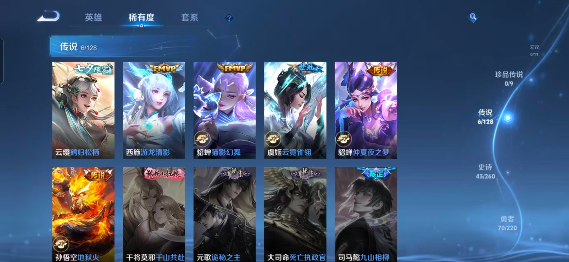 - PX_1988009-【240皮肤孙悟空幽冥火 至尊宝 宫本武藏幽冥之眼 幻海之心 澜愿照九州拓】:安卓Q-V6-最强王者段位-124英雄-240皮肤-1典藏-0无双-0珍品传说-8传说-61史诗 【荣耀典藏】:武则天英雄 【内测皮肤】:嬴政优雅恋人,高渐离玩趣恶龙,狂铁特工战影 【传说皮肤】:武则天海洋之心,孙悟空地狱火,宫本武藏地狱之眼,达摩黄金狮子座,貂蝉猫影幻舞,诸葛亮时雨天司,桑启鸣野