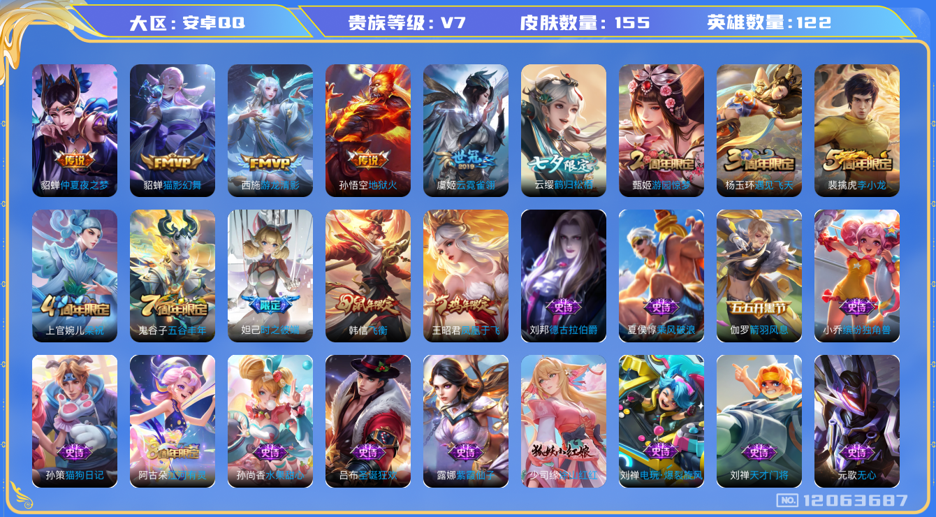 - [11683486]V8 1典藏 23传说 124英雄 358皮肤 可修改实名 优质装备:鸣剑·曳影,黄金狮子座,黄金射手座,云鹰飞将(小将军),绛天战甲(鸡嘴战神),炽阳神光,一念神魔,末日机甲-孙尚香(绿蚂蚱),地狱火,地狱之眼,飞鸢探春,时之恋人-刘备(电焊工),超时空战士-狄仁杰,山海·炽霜斩(李信年限),燃星之曲,澜逐花归海 传说皮:落雪白狼,幻光神枪 珍宝阁皮:胡桃夹子,玩趣恶龙 限定皮:愿照·岁时盈(虞姬年限),鸣野蒿,至尊宝,白虎志(电光耗子),飞衡(韩信年限),怒海麟威,五谷丰年,梁祝,御风骁将(吕布年限),李小龙,孙行者,大圣娶亲,寅虎·赤拳(老虎年限),玉兔公主,山海·玄木吟(马可年限) 史诗皮:器灵·浮梦炉,糖绘人间,化蝶舞,星界战将,石田雨龙,茶境仙,破空之剑,怒海争锋,蔬乡物语(鲁班七号),琥珀纪元伽罗,百相守梦-黄忠,紫霞仙子,苍穹之光,电玩小子(小书包),白龙吟,黄金分割率,特工魅影,千年之狐,永昼,电玩·爆裂旋风,末日机甲-莱西奥,江河有灵,百解令(蒙犽),高渐离燃音魔法,蒙恬荣光圣徽,偶像歌手,白蛇,魅语,晚萤,末日机甲-吕布,猫狗日记-大乔,时之恋人-孙尚香,乱世虎臣,节奏热浪,女仆咖啡,水果甜心,星夜王子,心灵骇客,功夫厨神,德古拉伯爵,暗隐猎兽者,幽灵船长,鬼剑武藏,心灵战警,舞动绿茵,地狱岩魂,纤云弄巧,繁星吟游(呼啦呼啦),拒霜思,缤纷独角兽,乘风破浪,逐浪之夏,水晶猎龙者,曙光守护者,箭羽风息,金属风暴,原初追逐者,圣诞狂欢,圣诞恋歌,鹰眼统帅,王者之锤,魅力维加斯,黎明之约,赏金猎手,天秀·音浪,无心,未来纪元-赵云