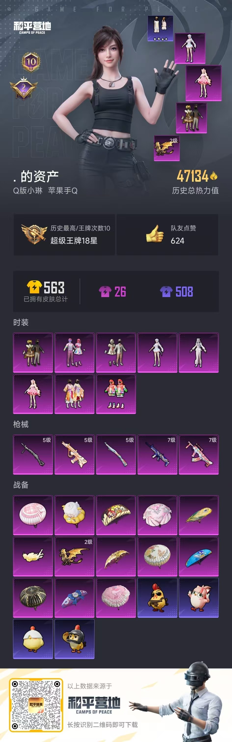 - QQ 可二次 皮肤资产价值145670 使用源晶点数2040 拥有皮肤171 段位Lv.144黄金II 步枪45 近战武器20 手枪VCT3 手枪37 狙击枪21 套装12 霰弹枪11 机枪12 冲锋枪19 英雄27 热门卡面11 热门挂饰18