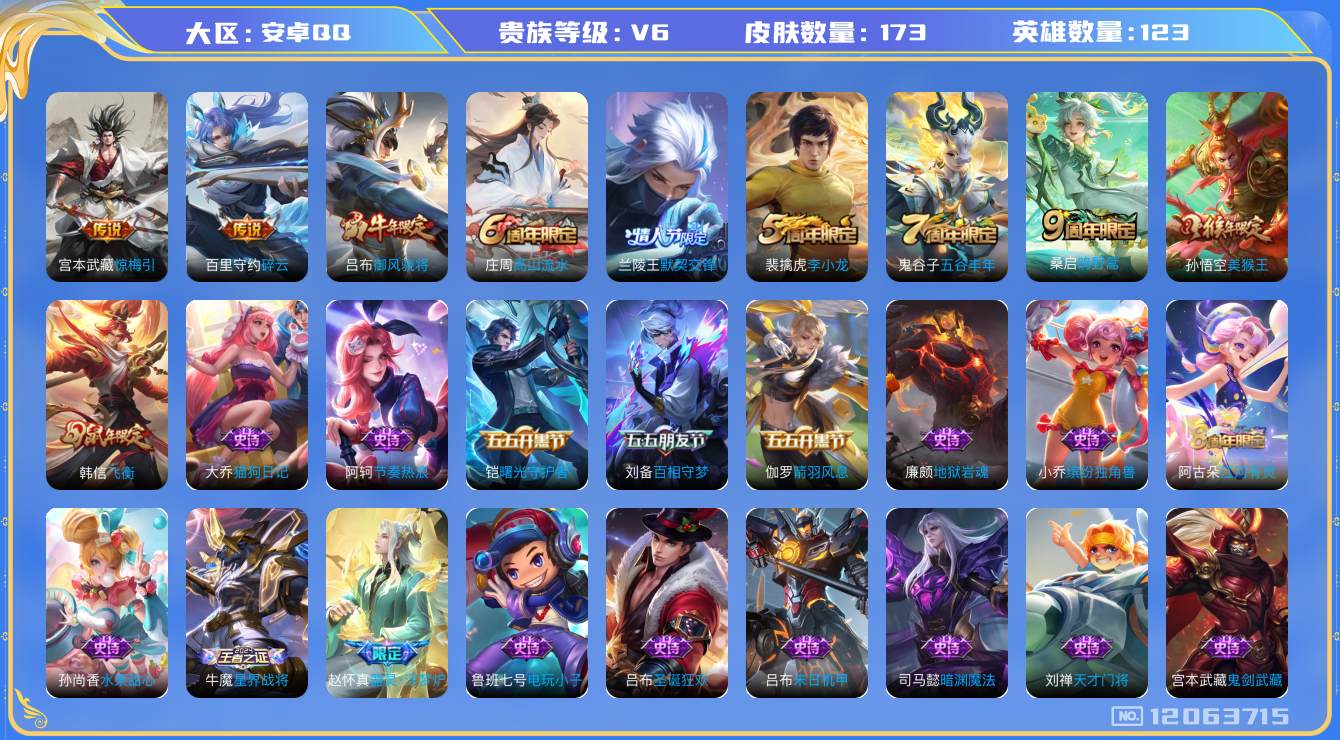 [12063715]V6 4传说 123英雄 173皮肤 可修改实名 优质装备:碎云,惊梅引 珍宝阁皮:万物之道,玩趣恶龙 限定皮:鸣野蒿,飞衡(韩信年限),高山流水,五谷丰年,御风骁将(吕布年限),李小龙,默契交锋-兰陵王,美猴王 史诗皮:器灵·浮梦炉,星界战将,龙之律动,电玩小子(小书包),江河有灵,百解令(蒙犽),蒙恬荣光圣徽,冰冠公主,百相守梦(刘备),末日机甲-吕布,猫狗日记-大乔,节奏热浪,女仆咖啡,摇滚巨星,水果甜心,天才门将,暗隐猎兽者,鬼剑武藏,暗渊魔法,舞动绿茵,地狱岩魂,纤云弄巧,拒霜思,缤纷独角兽,逐浪之夏,曙光守护者,箭羽风息,金属风暴,原初追逐者,圣诞狂欢,鹰眼统帅,魅力维加斯,未来纪元-赵云