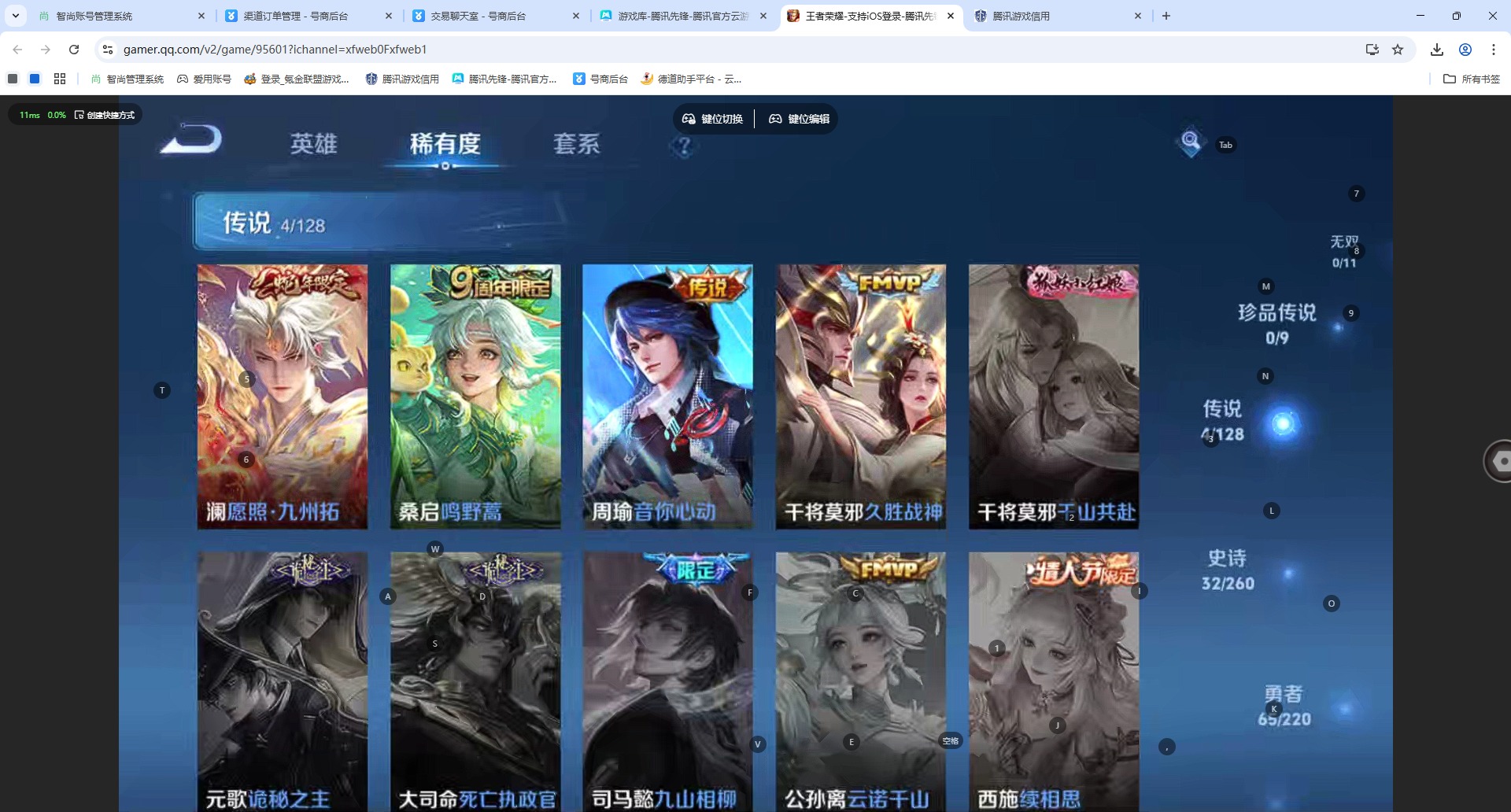 - [12297048]V9 1典藏 1珍品传说 22传说 125英雄 325皮肤 可修改实名 优质装备:全息碎影(猴子典藏),怪盗基德,黄金射手座,云鹰飞将(小将军),绛天战甲(鸡嘴战神),猫影幻舞,久胜战神,一念神魔,末日机甲-孙尚香(绿蚂蚱),地狱火,零号·赤焰,李逍遥,乞巧织情,挚爱之约,碎云,山海·苍雷引(电光曜子),妄想实况,澜逐花归海 珍宝阁皮:胡桃夹子,玩趣恶龙 限定皮:鸣野蒿,至尊宝,傲雪梅枪,时雨天司(水龙头),遇见飞天,高山流水,诗剑行,齐天大圣,五谷丰年,青龙志(铠年限),游园惊梦,梁祝,龙胆,烈魂,岱宗(典韦年限),李小龙,朱雀志(守约年限),孙行者,美猴王,寅虎·瑞焰(虎皮蛋子),时之奇旅-妲己 史诗皮:星界战将,谪仙醉月,织梦人,苍穹之光,电玩小子(小书包),白龙吟,黄金分割率,特工魅影,千年之狐,永昼,江河有灵,魅语,百解令(蒙犽),蒙恬荣光圣徽,冰冠公主,电玩·爆裂旋风,百相守梦(关羽),龙骑士(小龙虾),末日机甲-吕布,猫狗日记-大乔,乱世虎臣,节奏热浪,修罗,女仆咖啡,摇滚巨星,水果甜心,天才门将,星夜王子,心灵骇客,功夫厨神,德古拉伯爵,暗隐猎兽者,鬼剑武藏,心灵战警,舞动绿茵,地狱岩魂,诗语江南,纤云弄巧,繁星吟游(呼啦呼啦),拒霜思,缤纷独角兽,乘风破浪,逐浪之夏,水晶猎龙者,曙光守护者,箭羽风息,金属风暴,原初追逐者,圣诞狂欢,圣诞恋歌,鹰眼统帅,王者之锤,魅力维加斯,黎明之约,无心,未来纪元-赵云