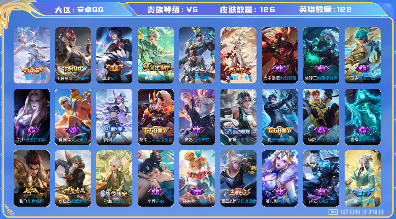 [12063748]V6 1典藏 4传说 122英雄 126皮肤 可修改实名 优质装备:最初的交响(伽罗典藏),久胜战神,音你心动-周瑜 限定皮:愿照·九州拓(澜年限),逐霄战戟,鸣野蒿 史诗皮:鸭鸭历险记-刘禅,器灵·浮梦炉,化蝶舞,龙之律动,茶境仙,破空之剑,战舞者,蒙犽顽岩魄,百相守梦-黄忠,特工魅影,冰冠公主,青蛇,偶像歌手,末日机甲-吕布,乱世虎臣,水果甜心,天才门将,德古拉伯爵,暗隐猎兽者,幽灵船长,鬼剑武藏,天秀·启明,乘风破浪,水晶猎龙者,曙光守护者,金属风暴,原初追逐者,鹰眼统帅,魅力维加斯,未来纪元-赵云