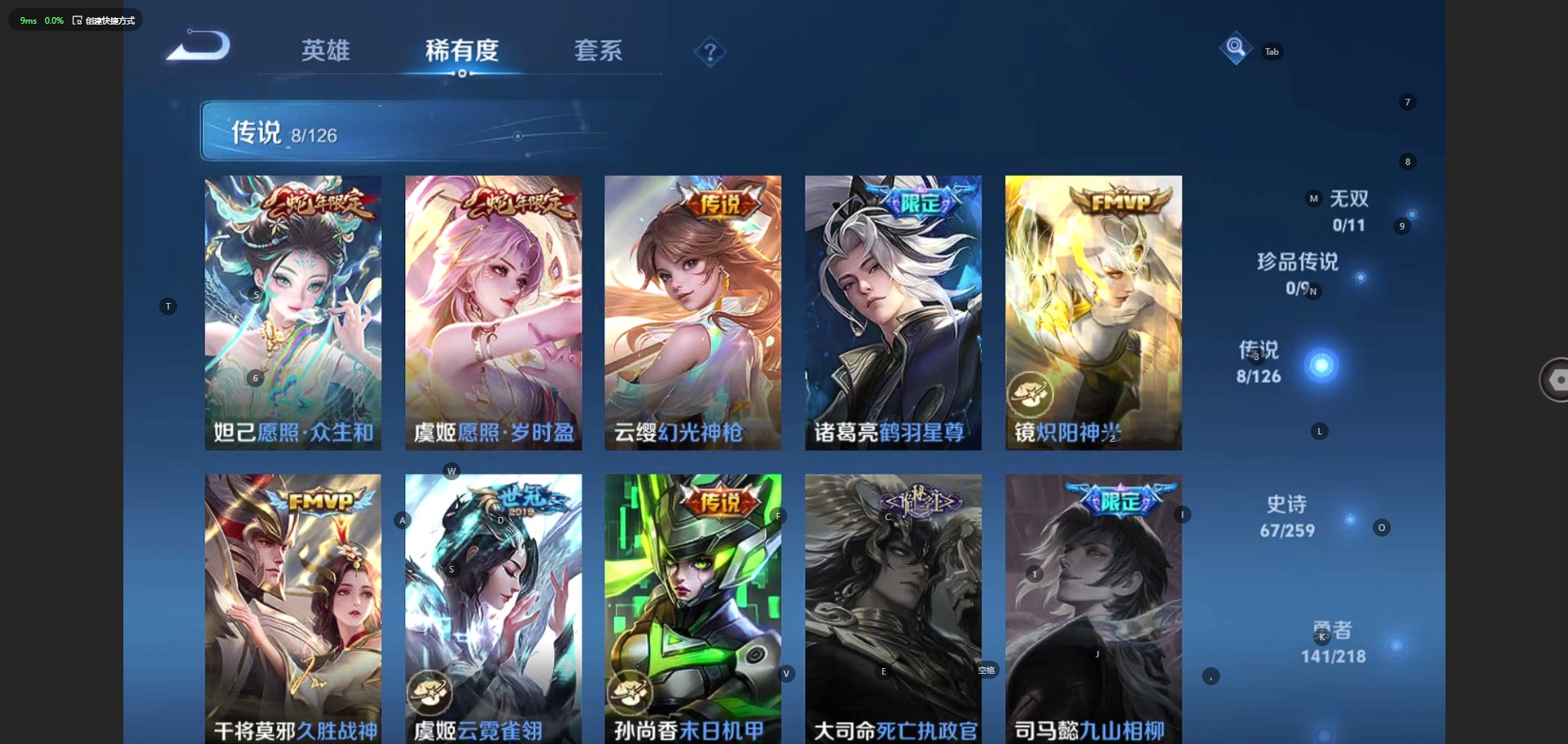- [36997]英雄数: 87 皮肤数: 2 勇者皮肤数: 46 史诗皮肤数: 10 传说皮肤数: 1 稀有英雄: 艾琳,娜可露露,不知火舞,桑启,戈娅 荣耀水晶: 天鹅之梦,星空梦想,倪克斯神谕,无限飓风号,活力突击,杀手不太冷,大秦宣太后,鸣剑·曳影,全息碎影,星域神启,九霄神辉,赤影疾锋,银白咏叹调,幻阙歌 当前段位: 星耀 限定皮肤: 高山流水,五谷丰年 内测皮肤: 女武神 史诗皮肤: 逐浪之夏,水果甜心,乘风破浪,水晶猎龙者 赛季/战令皮肤: 朔风刀,混沌棋,疑决卦,醍醐杖,原初探秘者,万华元夜,演武夺筹,驱傩正仪,千军破阵,星际陆战队(达摩),金庭之子,大漠名商,云中旅人,海盐诗旅 星传说: 时之愿境,女武神,幻海之心,未来机甲,幽冥之眼,蔷薇恋人,零号·雷霆,幽冥火,金色仲夏夜,玩趣恶龙,时之羁绊,时之思念,星际治安官,黛羽霜翎,无限倾慕 贵族积分: 1212 是否抢先服: 否 实名: 有人脸修改机会/实名是本人 普通皮肤: 五福同心,龙腾万里,归虚梦演(鲁班大师),归虚梦演(曜),掌控之力,守护之力,化身博士,缤纷绘卷,黄金武士,天使之翼,红桃皇后,星际陆战队(程咬金),阴阳师,汉昭烈帝,兔女郎,死亡骑士,救世之瞳,白色死神,野性能量,冰雪圆舞曲,露花倒影,花见巫女,未来旅行,龙域领主,蔷薇王座,万圣前夜,异域舞娘,潮流仙人,东海龙王,战争女神,精灵王,加勒比小姐,死神来了,赤焰之缨,启蛰,棒球奇才,海之征途,精准探案法,花间舞,绝影神枪,阿摩司公爵,特种部队,隐刃,木偶奇遇记,海军大将,一千零一夜,英喵野望,前尘,碧珀绯影