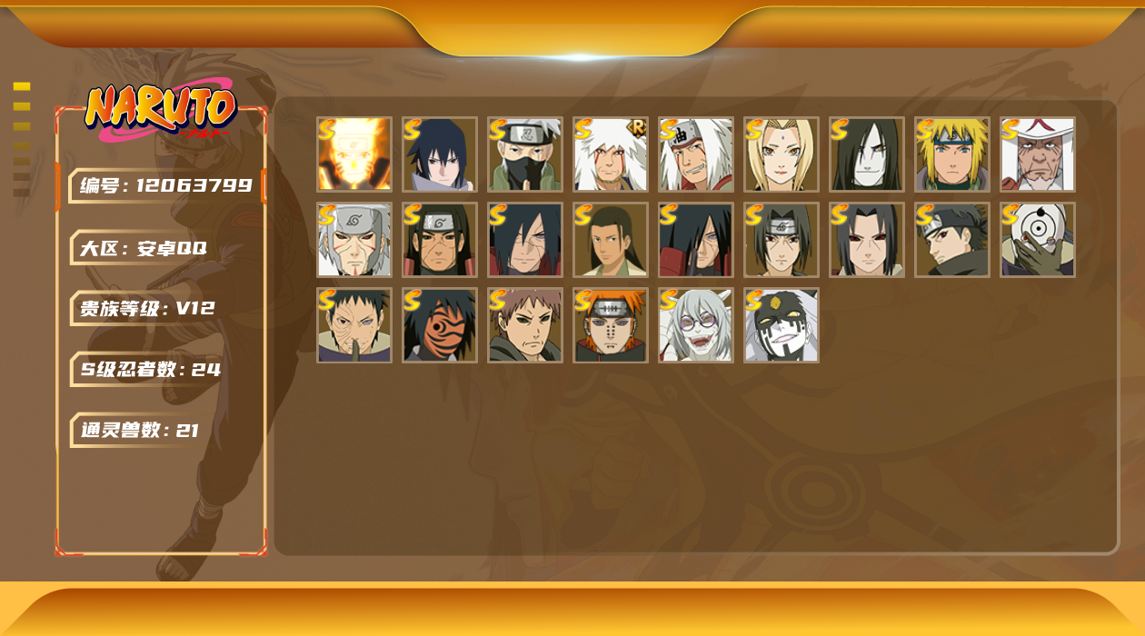 [12063799]V12 24S忍 32A忍 21通灵 1035.9W战力 可二次 可修改实名 优质装备:千手柱间「秽土转生」,罗砂「四代目风影」,宇智波鼬「秽土转生」,药师兜「仙人模式」,宇智波斑「秽土转生」,千手扉间「秽土转生」,宇智波带土 「忍界大战」,“宇智波斑” 「白面具」,漩涡鸣人 「九喇嘛连结」,神秘面具男 「红夜之刃」,宇智波佐助「永恒万花筒」,宇智波佐助「永恒万花筒」,千手柱间·木叶创立,宇智波斑「秽土转生·解」,大筒木桃式,宇智波止水「须佐能乎」,旗木卡卡西「须佐能乎」,自来也 「传说中的三忍」 S级忍者:自来也 「舞之豪杰」,宇智波鼬 「须佐能乎」,佩恩「天道」,猿飞日斩,波风水门,大蛇丸,纲手