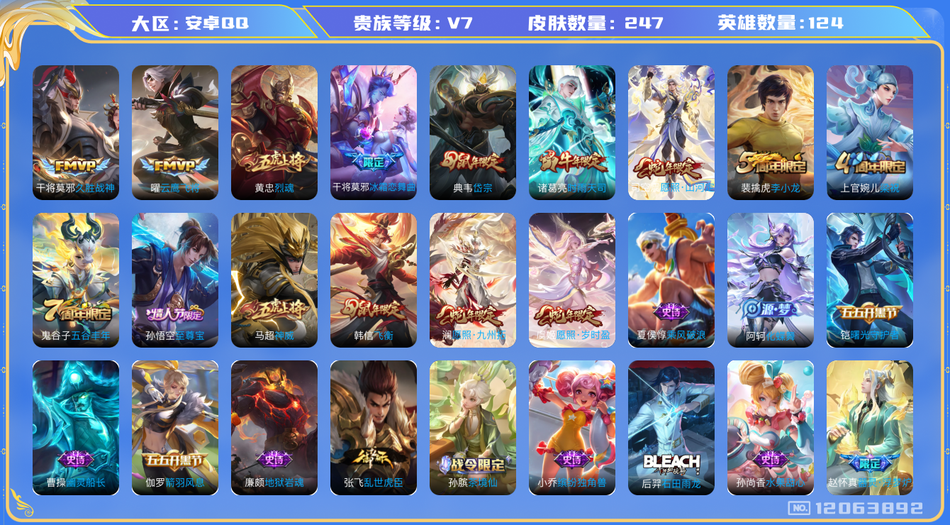 [12063892]V7 6传说 124英雄 247皮肤 可修改实名 优质装备:云鹰飞将(小将军),久胜战神 珍宝阁皮:蔷薇恋人,玩趣恶龙 限定皮:愿照·九州拓(澜年限),愿照·岁时盈(虞姬年限),愿照·山河定(司空震年限),至尊宝,时雨天司(水龙头),神威(电光马子),飞衡(韩信年限),五谷丰年,梁祝,烈魂,岱宗(典韦年限),李小龙,冰霜恋舞曲 史诗皮:器灵·浮梦炉,糖绘人间,绮世丹青,化蝶舞,石田雨龙,茶境仙,黄金分割率,特工魅影,千年之狐,无限星赏官,龙骑士(小龙虾),末日机甲-吕布,乱世虎臣,修罗,女仆咖啡,摇滚巨星,水果甜心,功夫厨神,暗隐猎兽者,幽灵船长,鬼剑武藏,心灵战警,舞动绿茵,地狱岩魂,纤云弄巧,繁星吟游(呼啦呼啦),缤纷独角兽,乘风破浪,逐浪之夏,水晶猎龙者,曙光守护者,箭羽风息,原初追逐者,圣诞狂欢,圣诞恋歌,鹰眼统帅,魅力维加斯,黎明之约,未来纪元-赵云