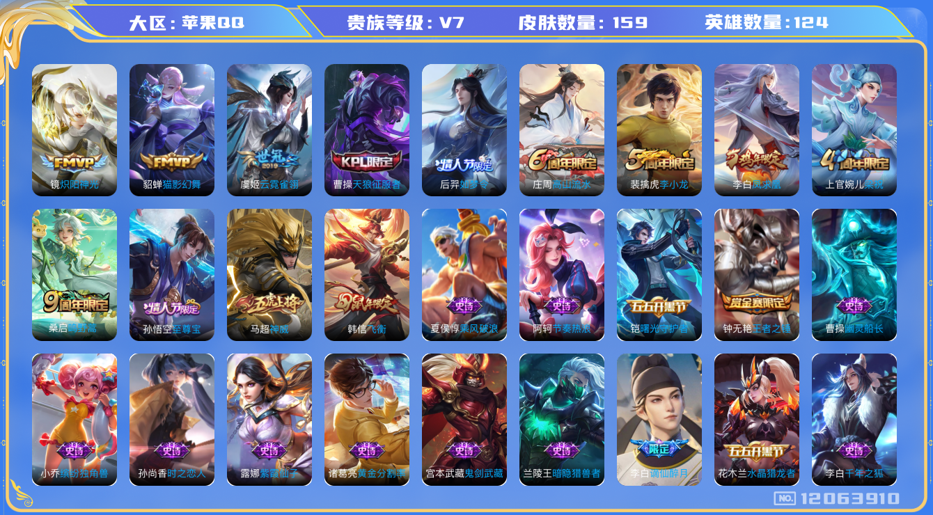 [12063910]V7 5传说 124英雄 159皮肤 可修改实名 优质装备:猫影幻舞,炽阳神光,云霓雀翎 限定皮:鸣野蒿,至尊宝,凤求凰(白切鸡),神威(电光马子),飞衡(韩信年限),高山流水,梁祝,天狼征服者,李小龙,如梦令-后羿 史诗皮:谪仙醉月,紫霞仙子,白龙吟,黄金分割率,千年之狐,冰冠公主,时之恋人-孙尚香,节奏热浪,修罗,摇滚巨星,星夜王子,心灵骇客,暗隐猎兽者,幽灵船长,鬼剑武藏,繁星吟游(呼啦呼啦),缤纷独角兽,乘风破浪,逐浪之夏,水晶猎龙者,曙光守护者,金属风暴,鹰眼统帅,王者之锤,魅力维加斯,未来纪元-赵云