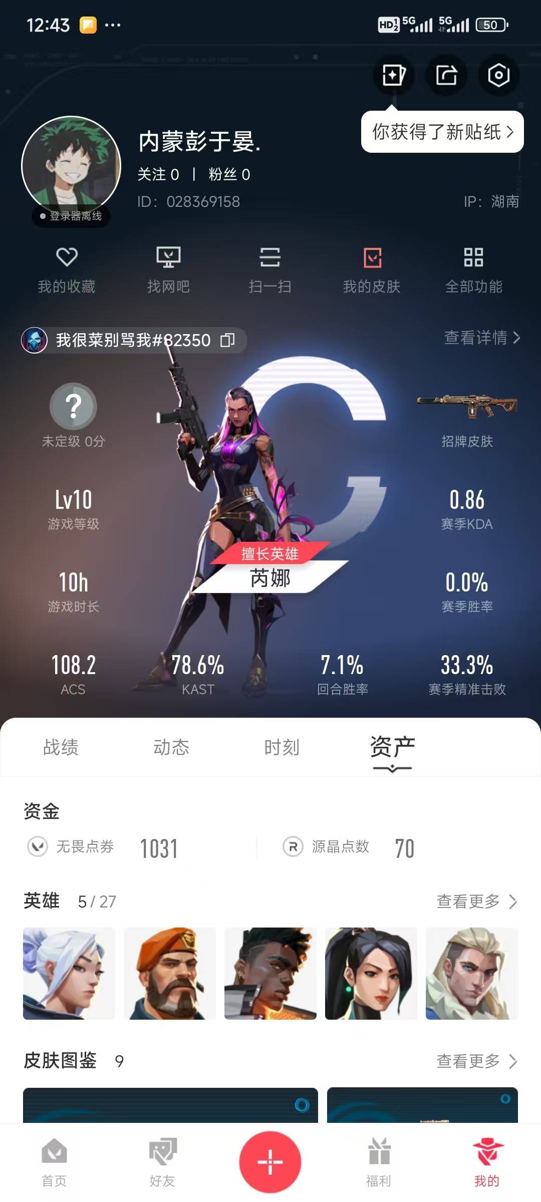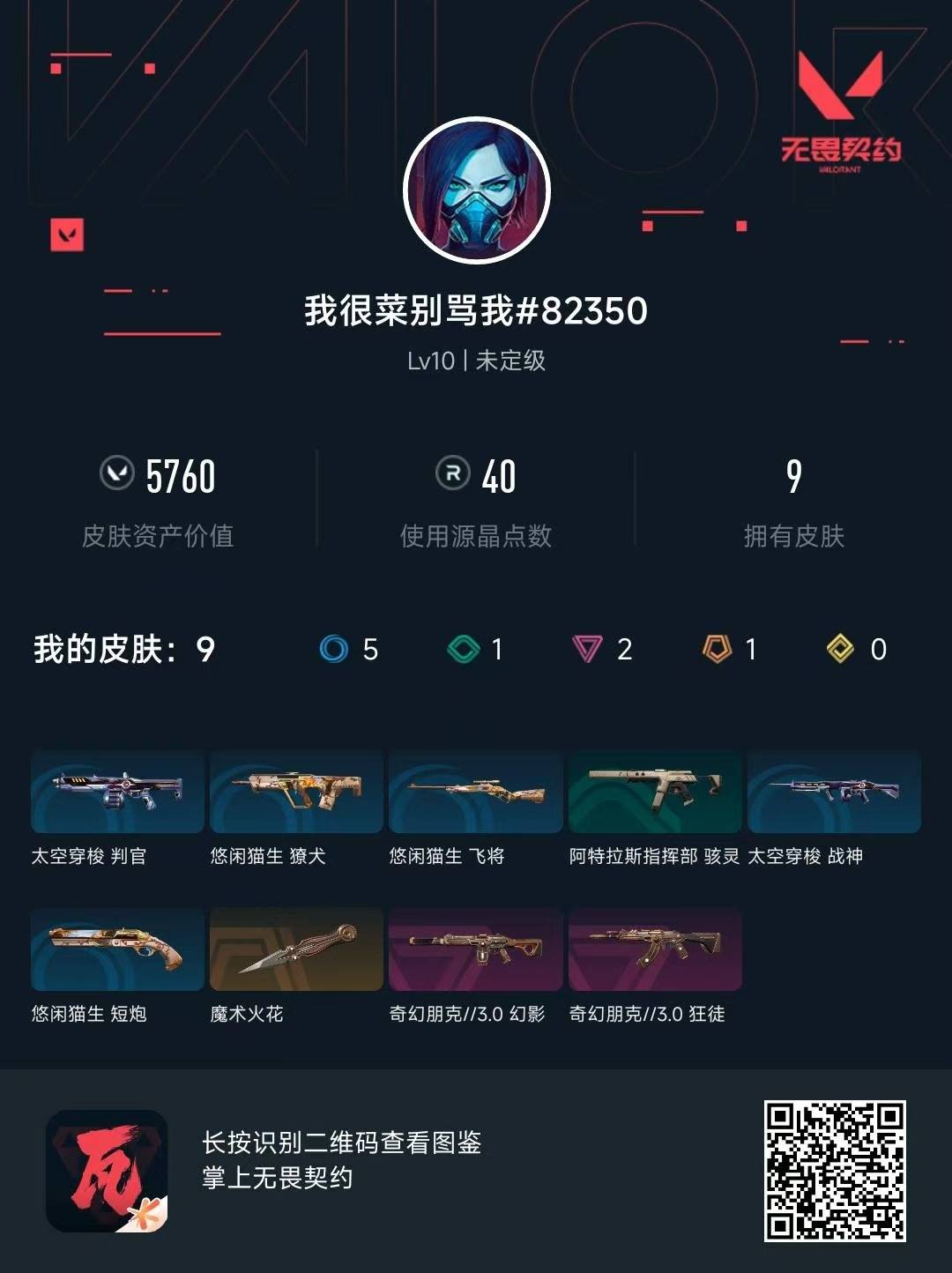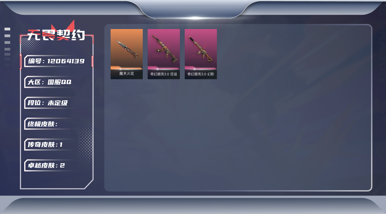 [12064139]1橙皮 2紫皮 9皮肤 5英雄 11卡面 40已用源晶 未定级 优质装备:魔术火花 步枪皮肤:奇幻朋克3.0狂徒,幻影-奇幻朋克3.0