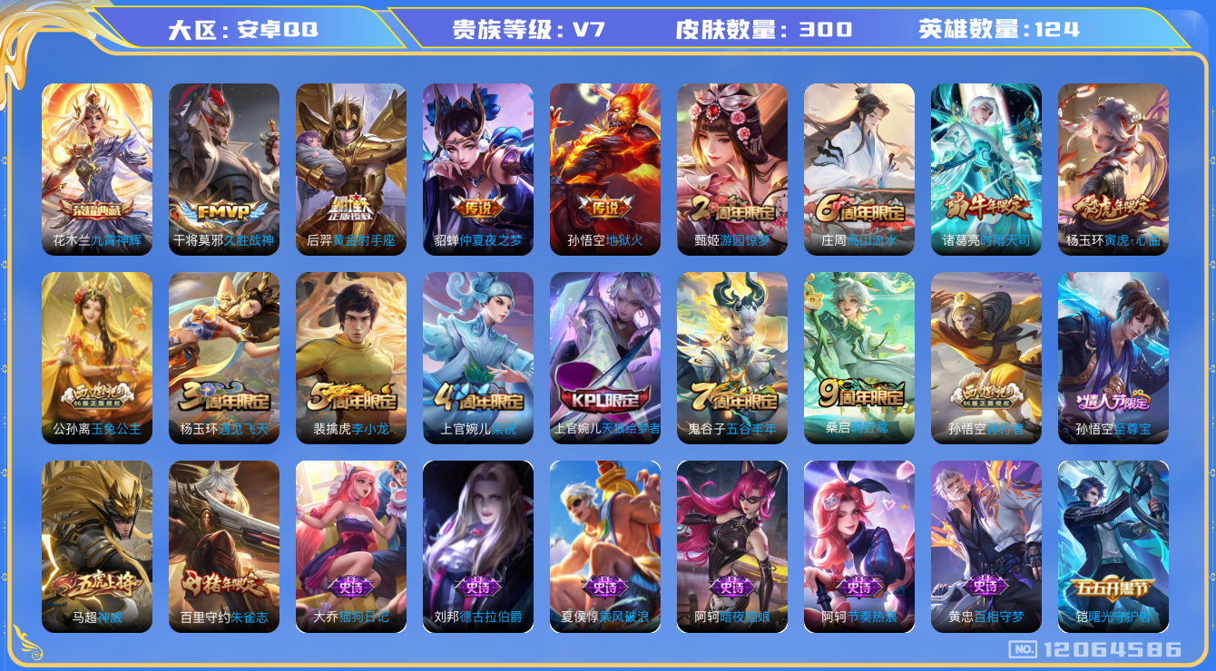 [12064586]V7 1典藏 6传说 124英雄 300皮肤 可修改实名 优质装备:九霄神辉(木兰典藏),黄金射手座,久胜战神,地狱火,仲夏夜之梦(大飞蛾),涂山容容 珍宝阁皮:万物之道,蔷薇恋人,女武神 限定皮:鸣野蒿,至尊宝,时雨天司(水龙头),神威(电光马子),遇见飞天,高山流水,五谷丰年,游园惊梦,梁祝,天狼绘梦者,李小龙,朱雀志(守约年限),孙行者,寅虎·心曲(虎婆),玉兔公主 史诗皮:星界战将,龙之律动,百相守梦-周瑜,蒙犽顽岩魄,百相守梦-黄忠,紫霞仙子,黄金分割率,特工魅影,千年之狐,江河有灵,魅语,蒙恬荣光圣徽,冰冠公主,偶像歌手,电玩·爆裂旋风,暗夜猫娘,龙骑士(小龙虾),猫狗日记-孙策,猫狗日记-大乔,时之恋人-孙尚香,乱世虎臣,节奏热浪,女仆咖啡,摇滚巨星,水果甜心,绅士熊喵,天才门将,星夜王子,心灵骇客,时之奇旅-安琪拉,功夫厨神,德古拉伯爵,暗隐猎兽者,幽灵船长,鬼剑武藏,心灵战警,舞动绿茵,地狱岩魂,纤云弄巧,繁星吟游(呼啦呼啦),拒霜思,缤纷独角兽,乘风破浪,逐浪之夏,水晶猎龙者,曙光守护者,箭羽风息,金属风暴,原初追逐者,圣诞狂欢,圣诞恋歌,鹰眼统帅,魅力维加斯,黎明之约,无心,未来纪元-赵云