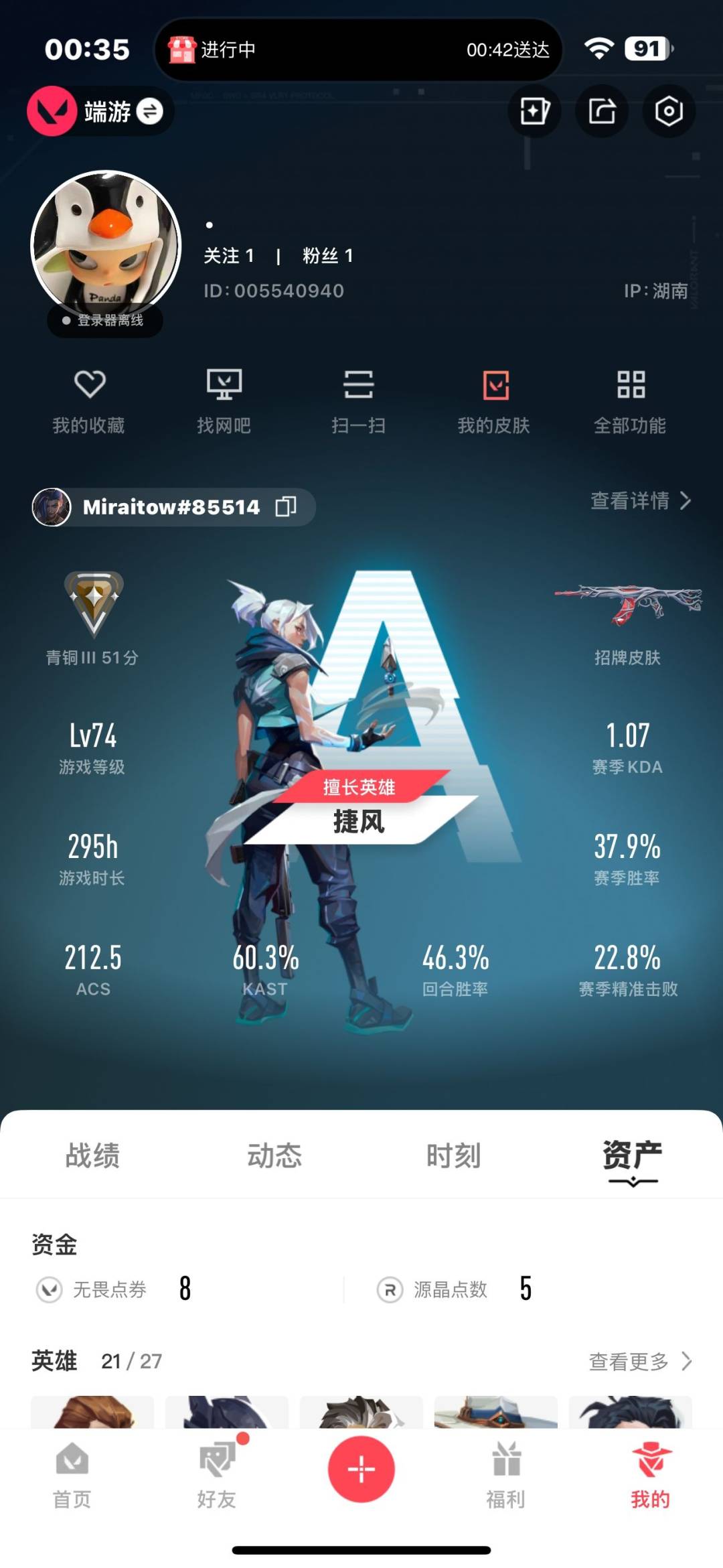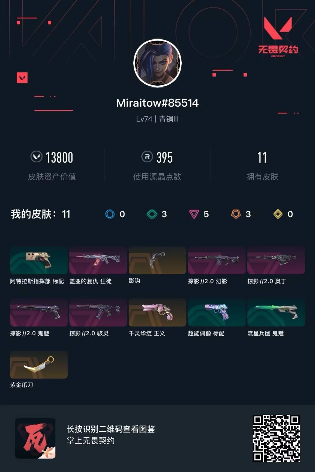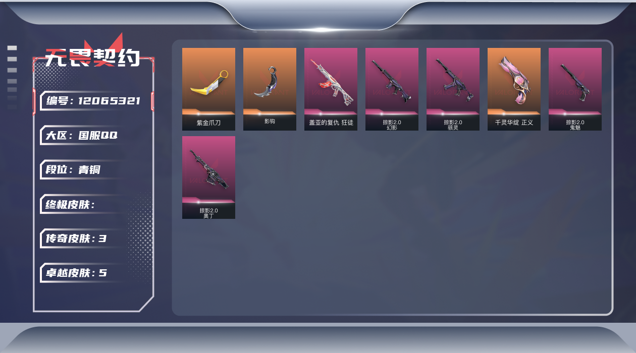 [12065321]3橙皮 5紫皮 11皮肤 21英雄 46卡面 395已用源晶 青铜 优质装备:狂徒-盖亚的复仇,正义-千灵华绽,紫金爪刀,影钩 套装:掠影2.0套装 佩枪皮肤:鬼魅-掠影2.0 冲锋枪皮肤:骇灵-掠影2.0 步枪皮肤:幻影-掠影2.0 机枪皮肤:奥丁-掠影2.0
