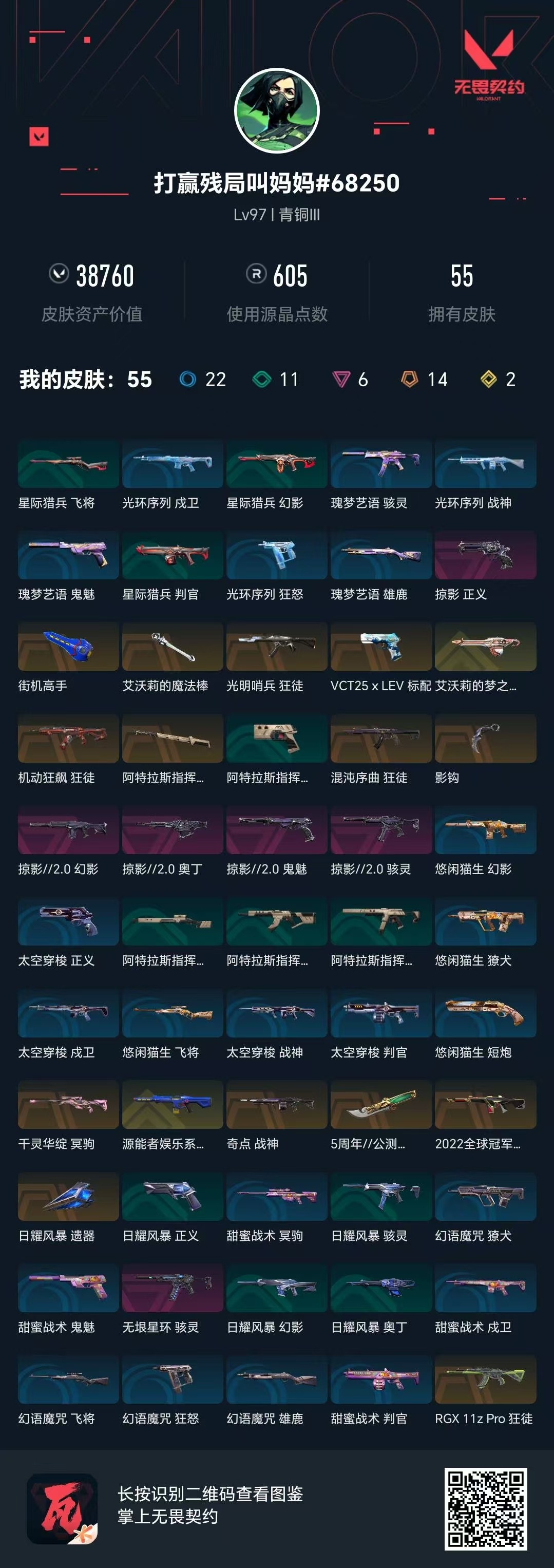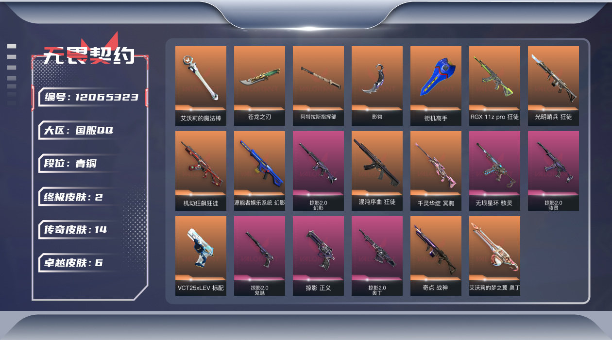 [12065323]14橙皮 2金皮 6紫皮 55皮肤 23英雄 74卡面 605已用源晶 青铜 优质装备:冥驹-千灵华绽,幻影-源能者娱乐系统,狂徒-混沌序曲,狂徒-光明哨兵,狂徒-机动狂飙,正义-掠影,奥丁-艾沃莉的梦之翼,街机高手,艾沃莉的魔法棒,苍龙之刃,阿特拉斯指挥部,影钩 套装:掠影2.0套装 佩枪皮肤:标配-VCT25xLEV,鬼魅-掠影2.0 冲锋枪皮肤:骇灵-掠影2.0,骇灵-无垠星环 步枪皮肤:幻影-掠影2.0,RGX 11z pro 狂徒 机枪皮肤:战神-奇点,奥丁-掠影2.0