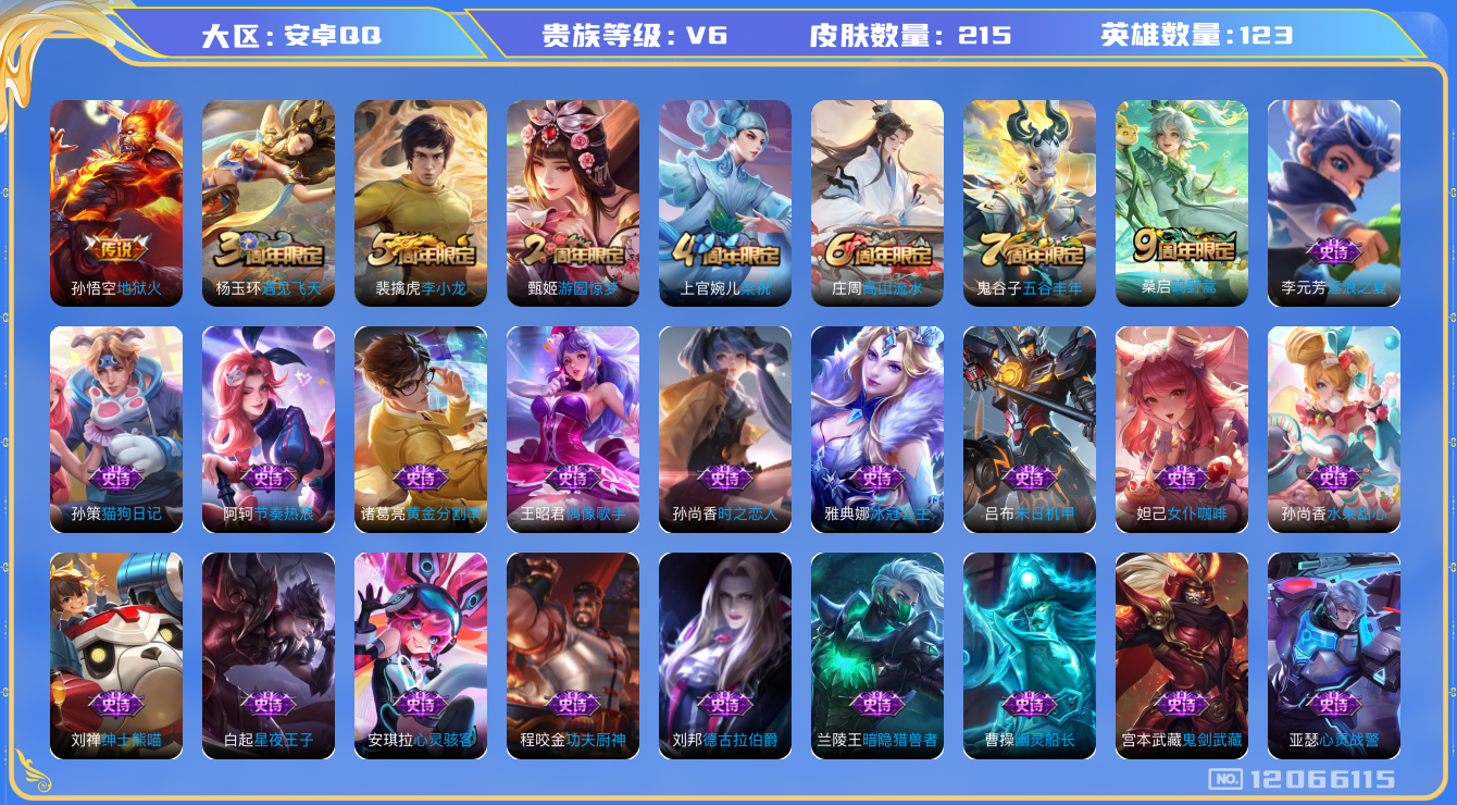 [12066115]【商品标题】:安卓Q-V6-尊贵铂金II段位-123英雄-215皮肤-0典藏-0珍品无双-0无双-0珍品传说-2传说-54史诗