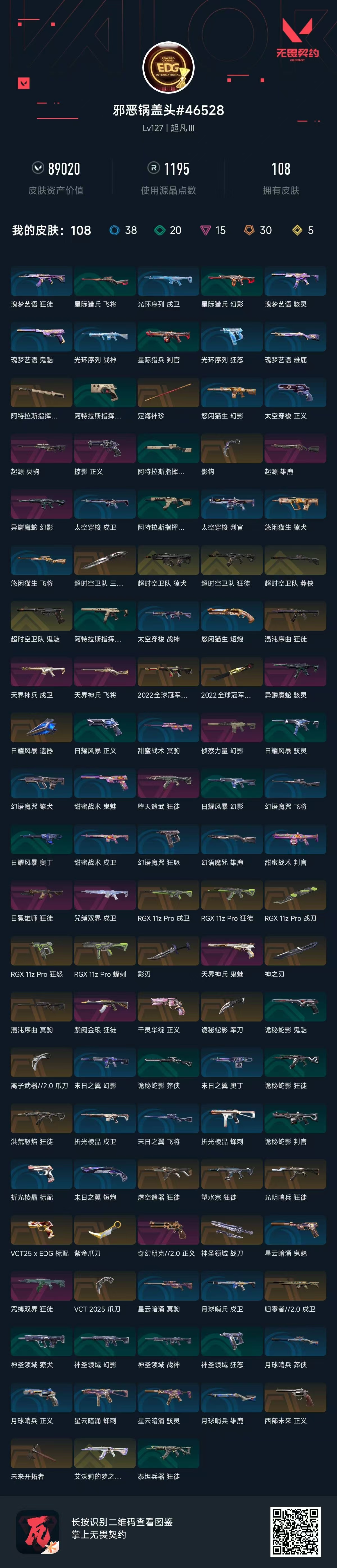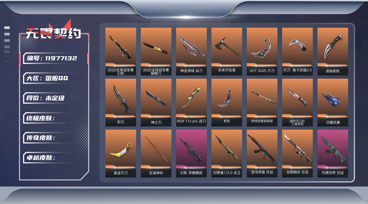 [11977132]段位: 未定级 亮点皮肤: 幻影-2022全球冠军赛,蝴蝶刀-2022全球冠军赛 近战武器皮肤: 定海神珍,紫金爪刀,影刃,神圣领域 战刀,未来开拓者,VCT 2025 爪刀,离子武器2.0 爪刀,诡秘蛇影,神之刃,RGX 11z pro 战刀,日耀风暴,超时空卫队 三棱军刺,阿特拉斯指挥部,影钩 步枪皮肤: 狂徒-紫阙金琅,幻影-侦察力量,戍卫-天界神兵,狂徒-塑水宗,狂徒-堕天遗武,狂徒-洪荒怒焰,狂徒-日冕雄师,狂徒-艾沃莉的梦之翼,狂徒-混沌序曲,狂徒-光明哨兵,狂徒-咒缚双界,戍卫-咒缚双界,戍卫-归零者//2.0,幻影-异鳞魔蛇,狂徒-虚空遗器,戍卫-RGX 11z pro,狂徒-RGX 11z pro,狂徒-超时空卫队,獠犬-超时空卫队 佩枪皮肤: 鬼魅-天界神兵,正义-千灵华绽,正义-掠影,标配-VCT25xEDG,正义-西部未来,正义-奇幻朋克2.0,狂怒-RGX 11z pro,鬼魅-超时空卫队 狙击枪皮肤: 冥驹-起源,飞将-天界神兵,冥驹-混沌序曲,莽侠-超时空卫队 冲锋枪皮肤: 骇灵-异鳞魔蛇,蜂刺-RGX 11z pro 霰弹枪皮肤: 雄鹿-起源