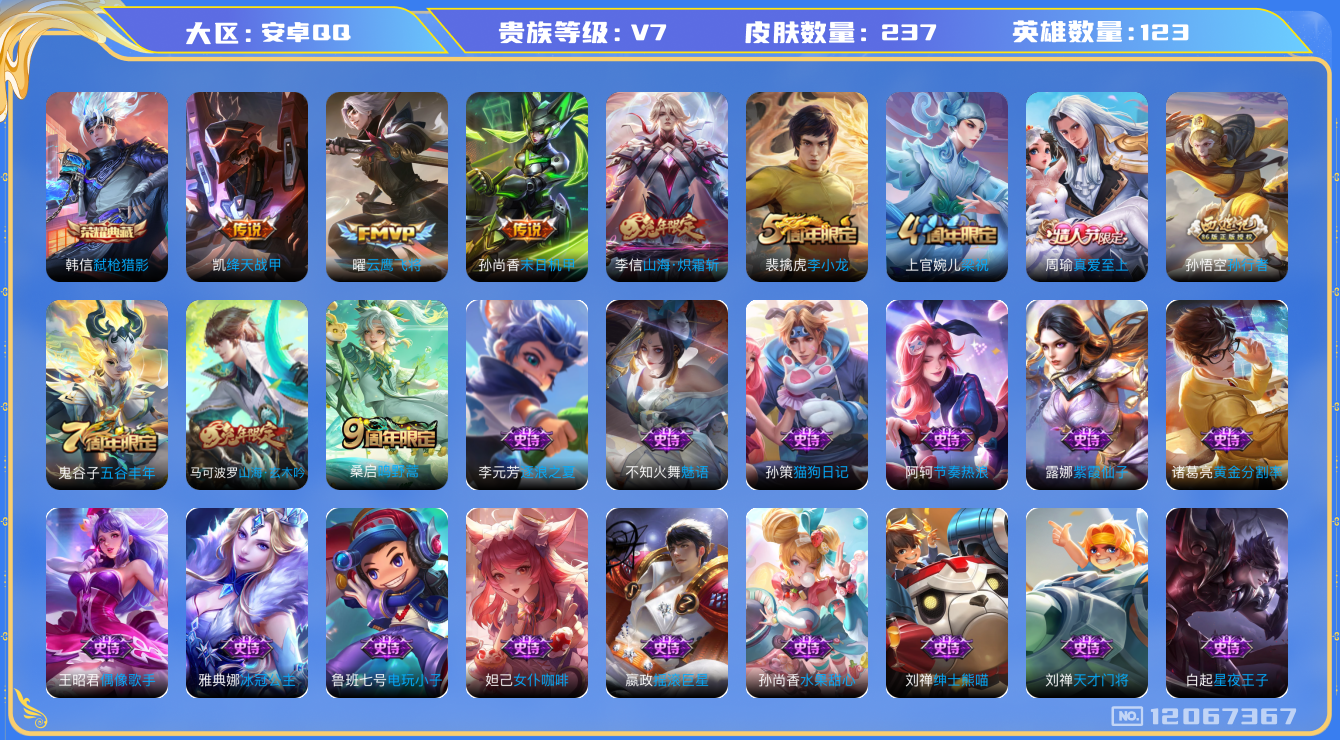 [12067367]【商品标题】:安卓Q-V7-最强王者段位-123英雄-237皮肤-1典藏-0珍品无双-0无双-0珍品传说-5传说-74史诗