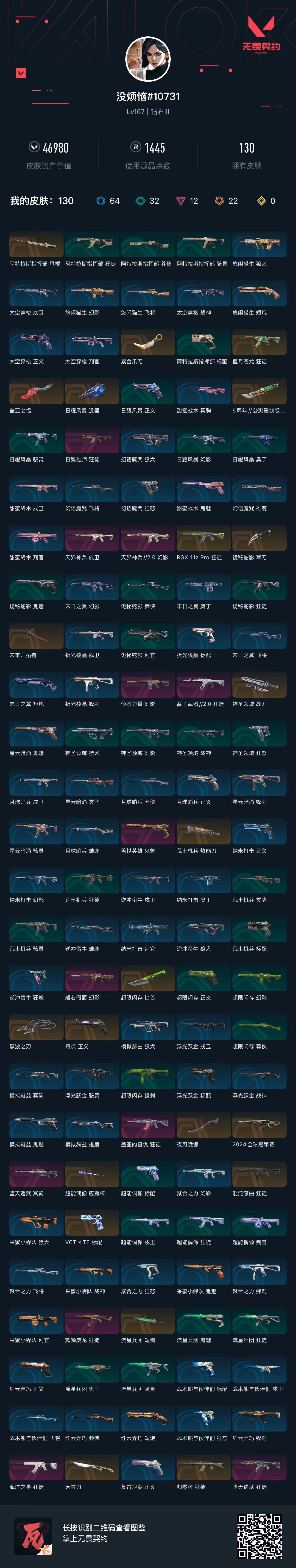 [11681981]段位: 未定级 亮点皮肤: 幻影-2024全球冠军赛 近战武器皮肤: 天玄刀,紫金爪刀,黑波之刃,超能偶像 应援棒,短剑-流星兵团,夜刃诡镰,匕首-超限闪存,荒土机兵热能刀,神圣领域 战刀,未来开拓者,诡秘蛇影,日耀风暴,苍龙之刃,阿特拉斯指挥部 步枪皮肤: 狂徒-盖亚的复仇,狂徒-偃月苍龙,幻影-侦察力量,狂徒-归零者,戍卫-天界神兵,狂徒-耀鳞威龙,狂徒-堕天遗武,幻影-天界神兵2.0,幻影-般若假面,狂徒-海洋之星,狂徒-日冕雄师,狂徒-混沌序曲,狂徒-离子武器2.0,狂徒-RGX 11z pro 佩枪皮肤: 正义-奇点,鬼魅-盖世英雄,标配-VCTxTE 狙击枪皮肤: 冥驹-堕天遗武