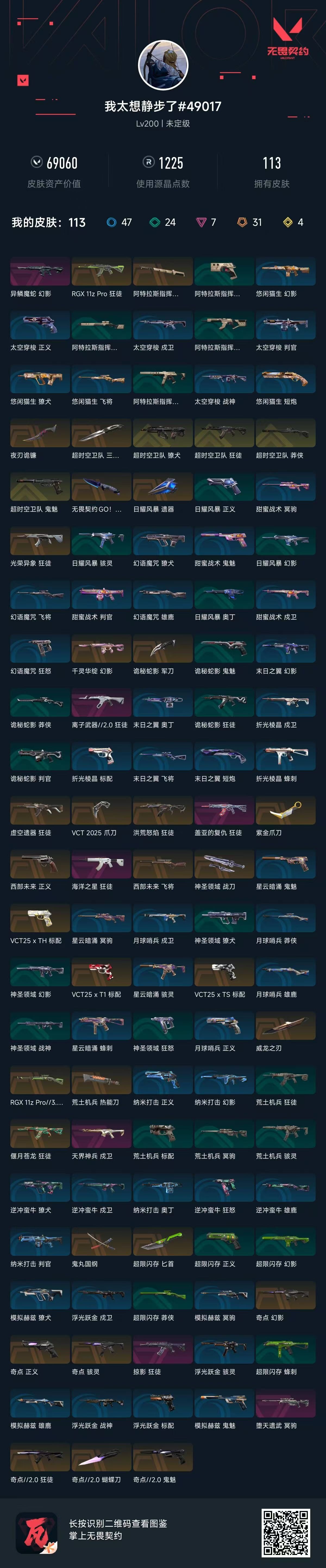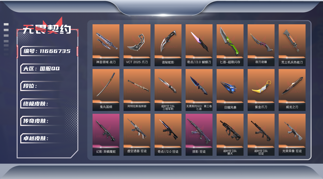 [11666735]近战武器皮肤: 紫金爪刀,威龙之刃,夜刃诡镰,匕首-超限闪存,蝴蝶刀-奇点//2.0,荒土机兵热能刀,鬼丸国纲,神圣领域 战刀,VCT 2025 爪刀,诡秘蛇影,日耀风暴,匕首-无畏契约GO!第三卷,超时空卫队 三棱军刺,阿特拉斯指挥部 步枪皮肤: 幻影-奇点,狂徒-盖亚的复仇,狂徒-偃月苍龙,戍卫-天界神兵,狂徒-洪荒怒焰,幻影-千灵华绽,狂徒-海洋之星,狂徒-奇点//2.0,狂徒-掠影,幻影-异鳞魔蛇,狂徒-虚空遗器,狂徒-离子武器2.0,狂徒-RGX 11z pro,狂徒-光荣异象,狂徒-超时空卫队,獠犬-超时空卫队 佩枪皮肤: 正义-奇点,鬼魅-奇点//2.0,标配-VCT25xTH,标配-VCT25xTS,标配-VCT25xT1,正义-西部未来,鬼魅-超时空卫队 狙击枪皮肤: 冥驹-堕天遗武,莽侠-RGX 11z Pro 3.0,飞将-西部未来,莽侠-超时空卫队 冲锋枪皮肤: 骇灵-奇点