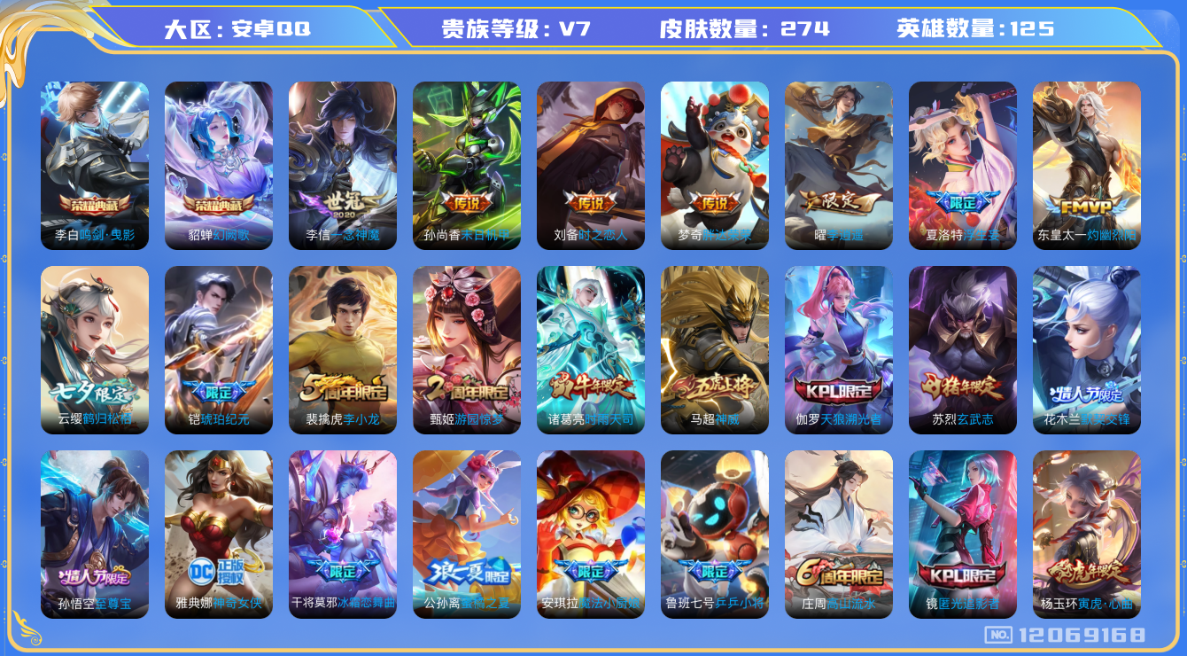 [12069168]【商品标题】:安卓Q-V5-至尊星耀IV段位-125英雄-272皮肤-1典藏-0珍品无双-0无双-0珍品传说-16传说-96史诗