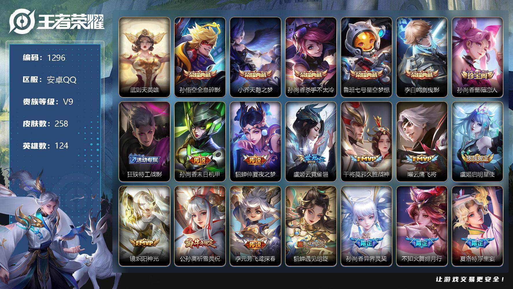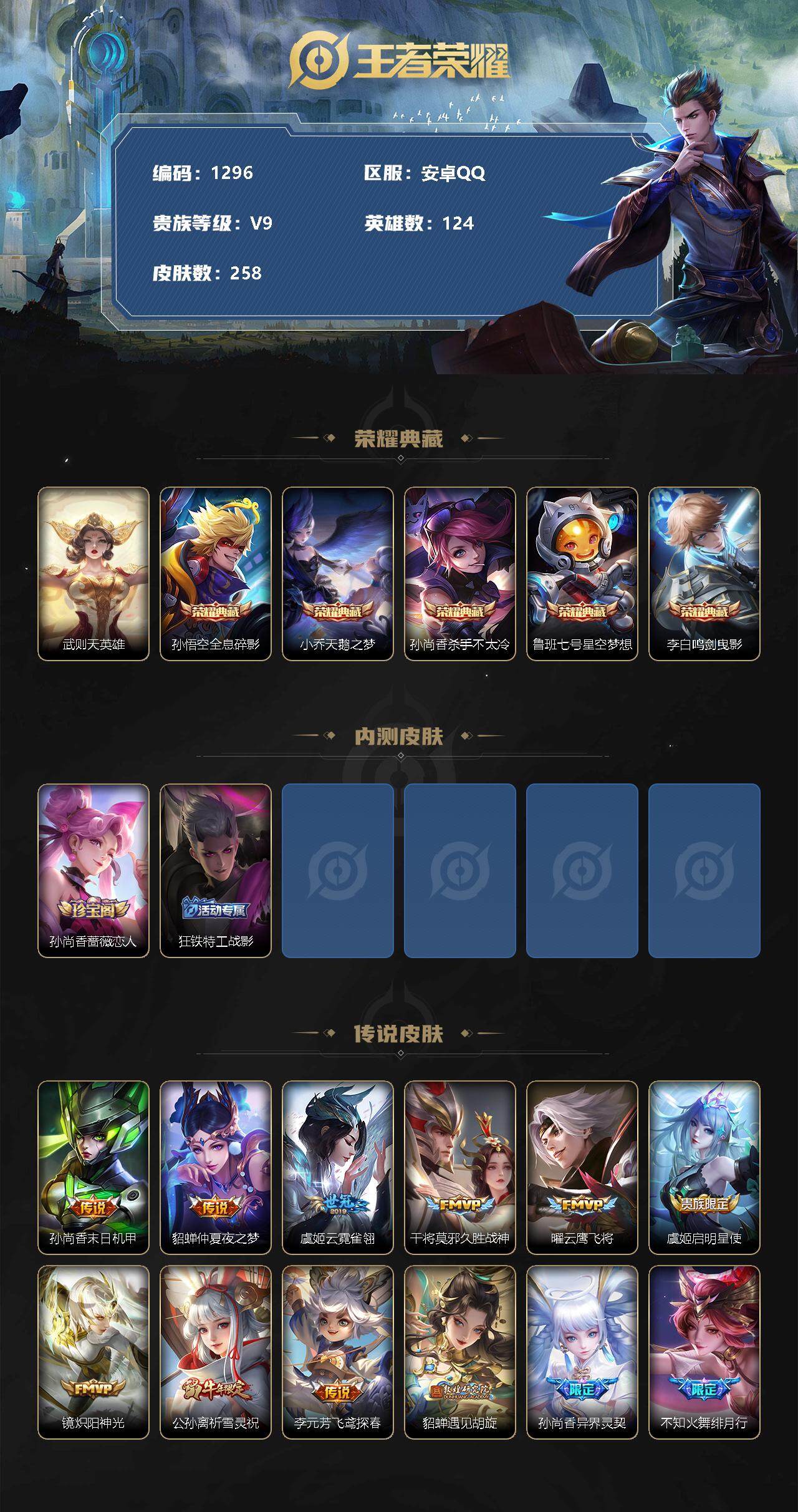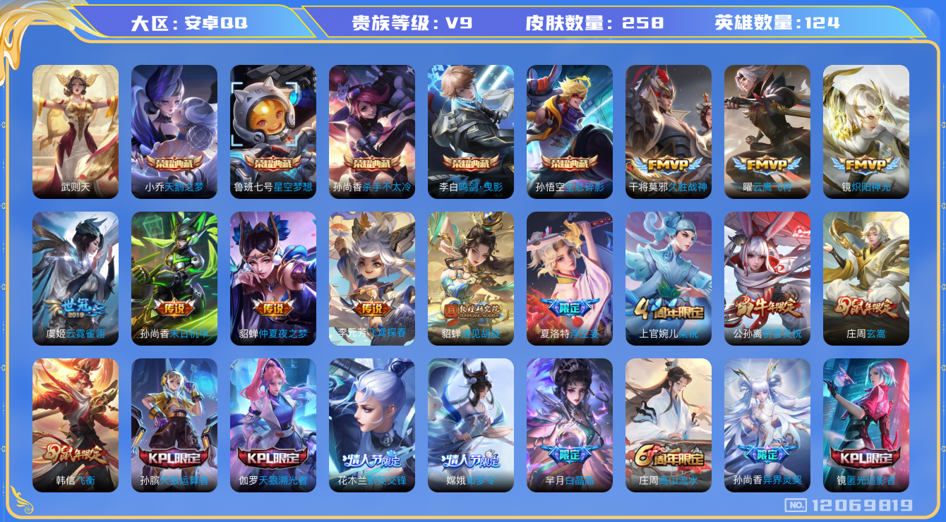 [12069819]【商品标题】:安卓Q-V9-至尊星耀II段位-124英雄-258皮肤-5典藏-0珍品无双-0无双-0珍品传说-13传说-69史诗