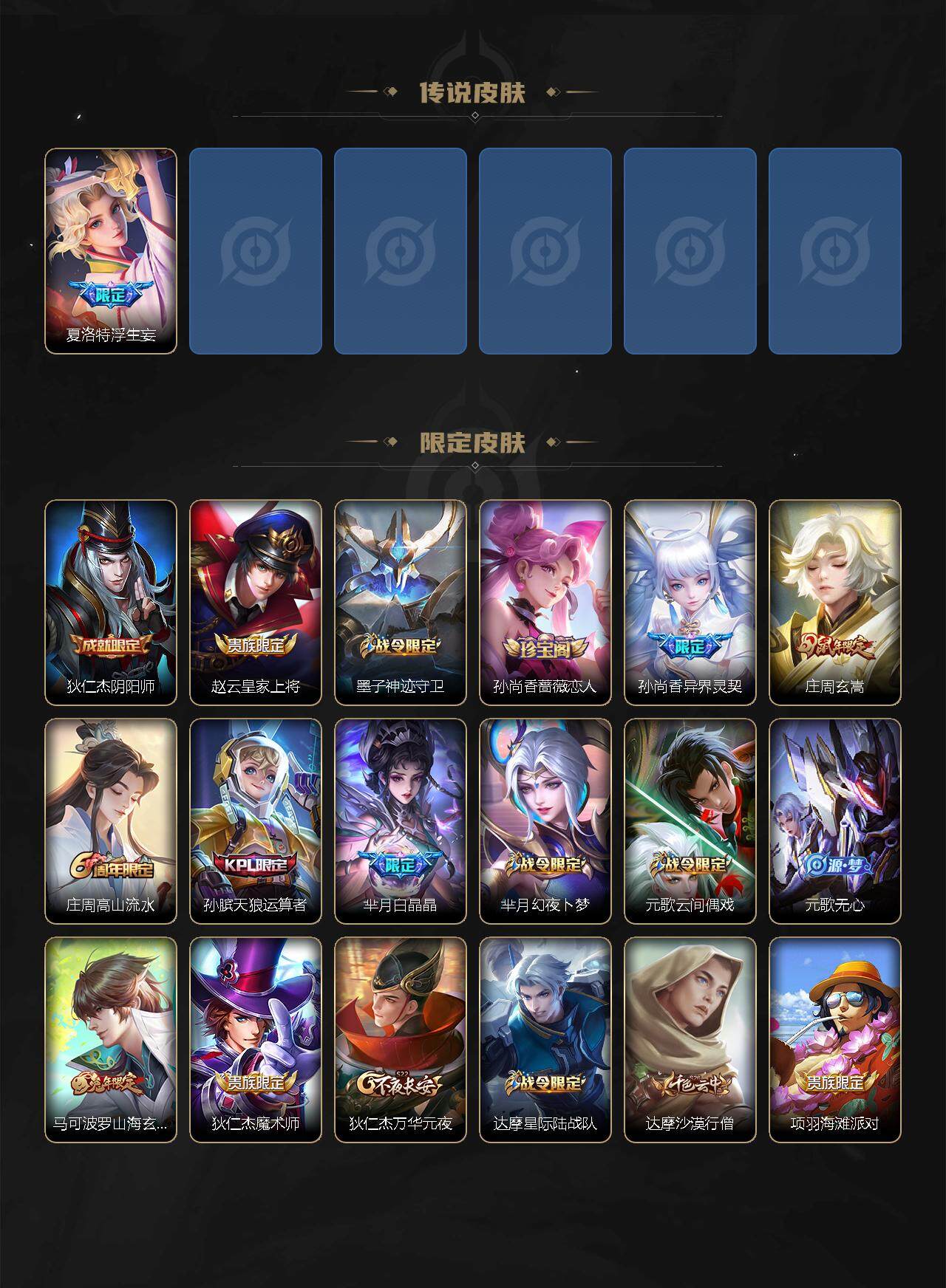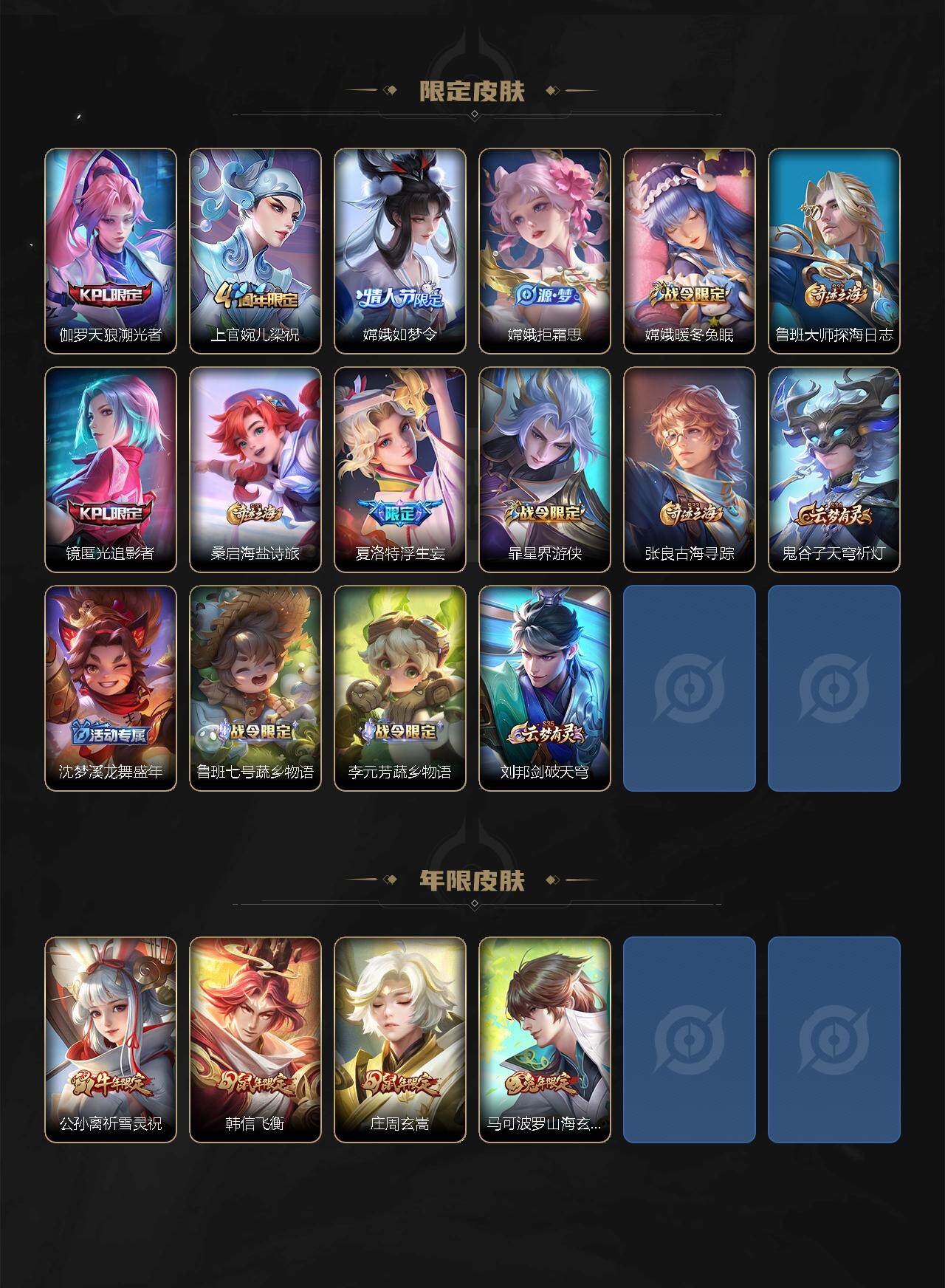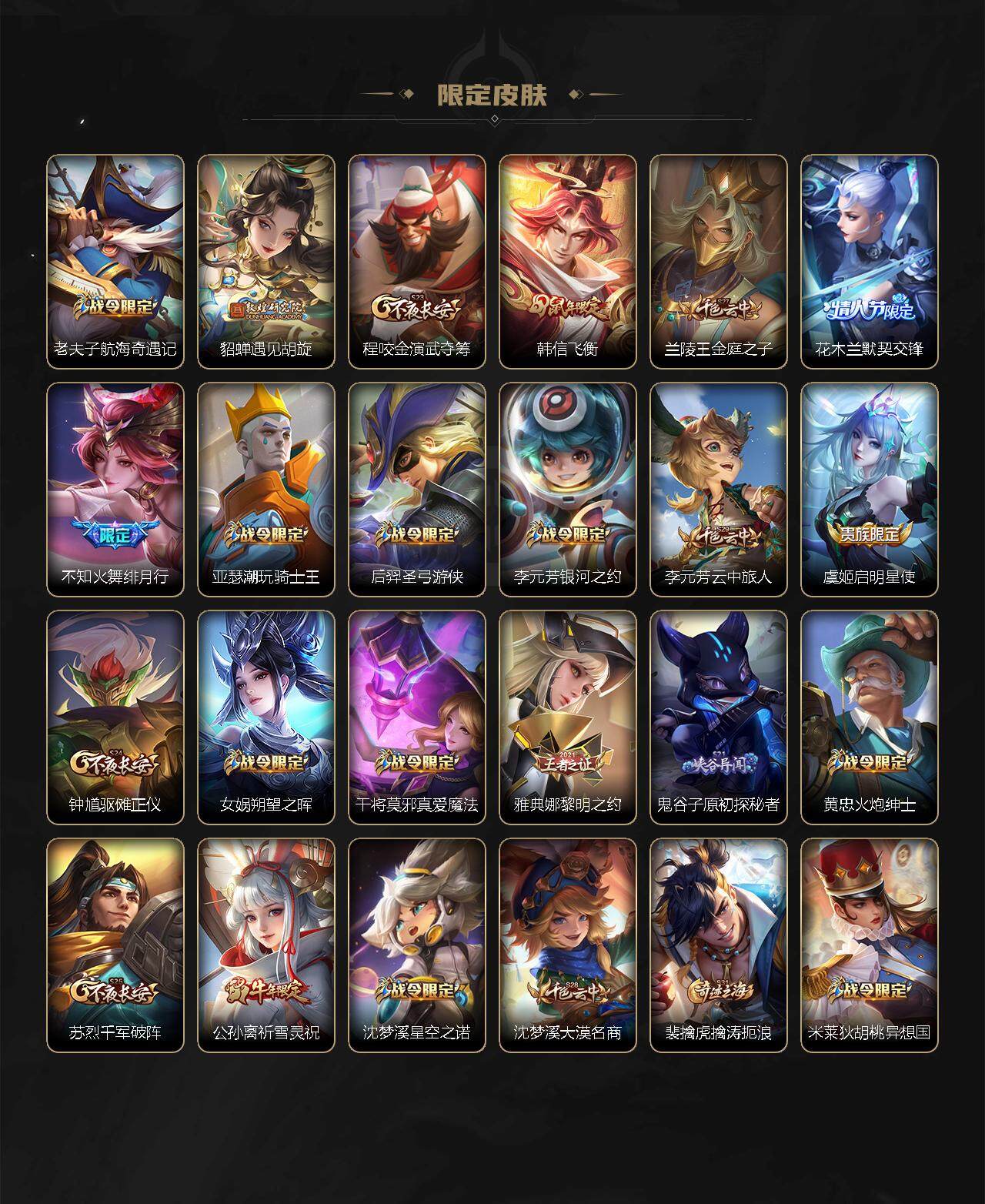 【限定皮肤】:狄仁杰阴阳师,赵云皇家上将,墨子神迹守卫,孙尚香蔷薇恋人,孙尚香异界灵契,庄周玄嵩,庄周高山流水,孙膑天狼运算者,芈月白晶晶,芈月幻夜卜梦,元歌云间偶戏,元歌无心,马可波罗山海玄木吟,狄仁杰魔术师,狄仁杰万华元夜,达摩星际陆战队,达摩沙漠行僧,项羽海滩派对,老夫子航海奇遇记,貂蝉遇见胡旋,程咬金演武夺筹,韩信飞衡,兰陵王金庭之子,花木兰默契交锋,不知火舞绯月行,亚瑟潮玩骑士王,后羿圣弓游侠,李元芳银河之约,李元芳云中旅人,虞姬启明星使,钟馗驱傩正仪,女娲朔望之晖,干将莫邪真爱魔法,雅典娜黎明之约,鬼谷子原初探秘者,黄忠火炮绅士,苏烈千军破阵,公孙离祈雪灵祝,沈梦溪星空之诺,沈梦溪大漠名商,裴擒虎擒涛扼浪,米莱狄胡桃异想国,伽罗天狼溯光者,上官婉儿梁祝,嫦娥如梦令,嫦娥拒霜思,嫦娥暖冬兔眠,鲁班大师探海日志,镜匿光追影者,桑启海盐诗旅,夏洛特浮生妄,暃星界游侠,张良古海寻踪,鬼谷子天穹祈灯,沈梦溪龙舞盛年,鲁班七号蔬乡物语,李元芳蔬乡物语,刘邦剑破天穹