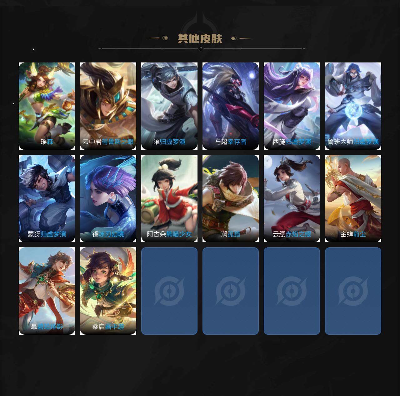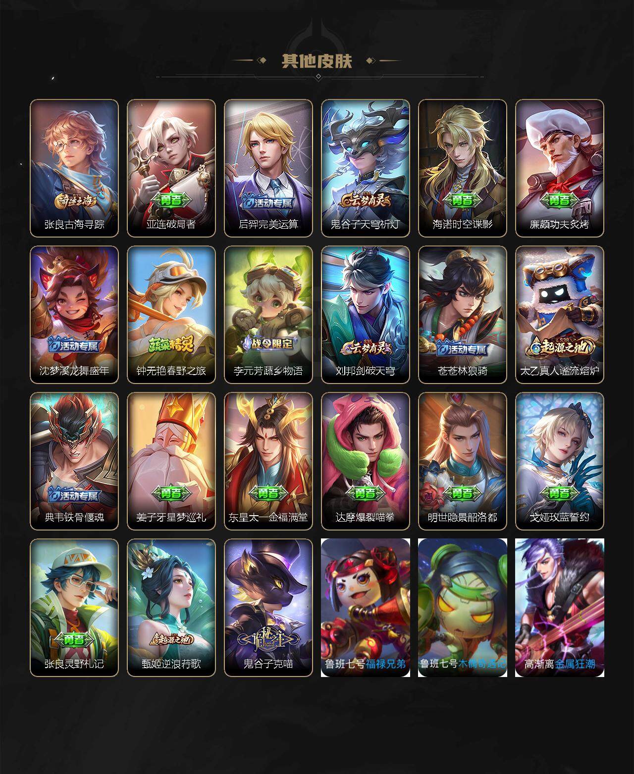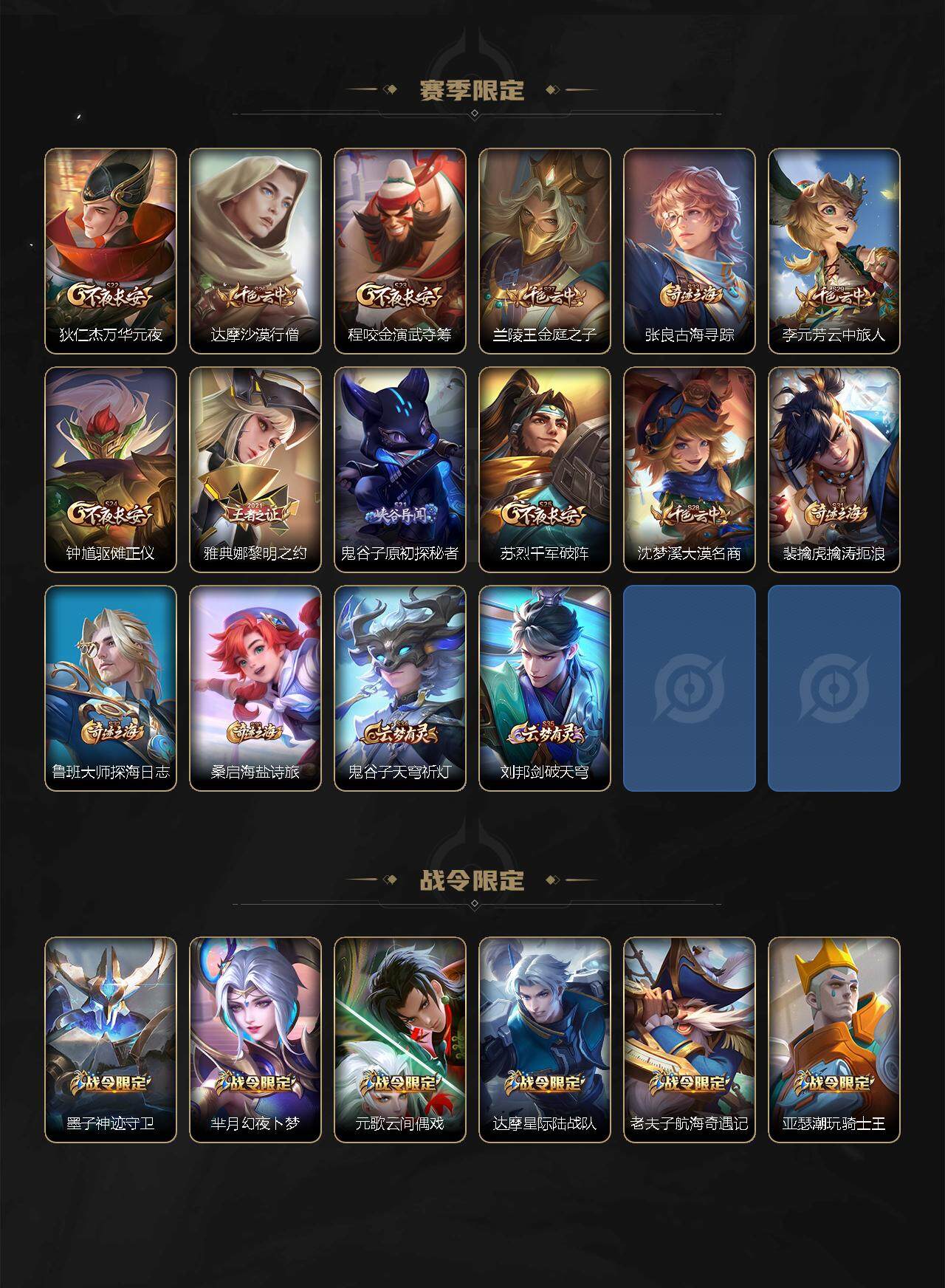 【赛季限定】:狄仁杰万华元夜,达摩沙漠行僧,程咬金演武夺筹,兰陵王金庭之子,张良古海寻踪,李元芳云中旅人,钟馗驱傩正仪,雅典娜黎明之约,鬼谷子原初探秘者,苏烈千军破阵,沈梦溪大漠名商,裴擒虎擒涛扼浪,鲁班大师探海日志,桑启海盐诗旅,鬼谷子天穹祈灯,刘邦剑破天穹