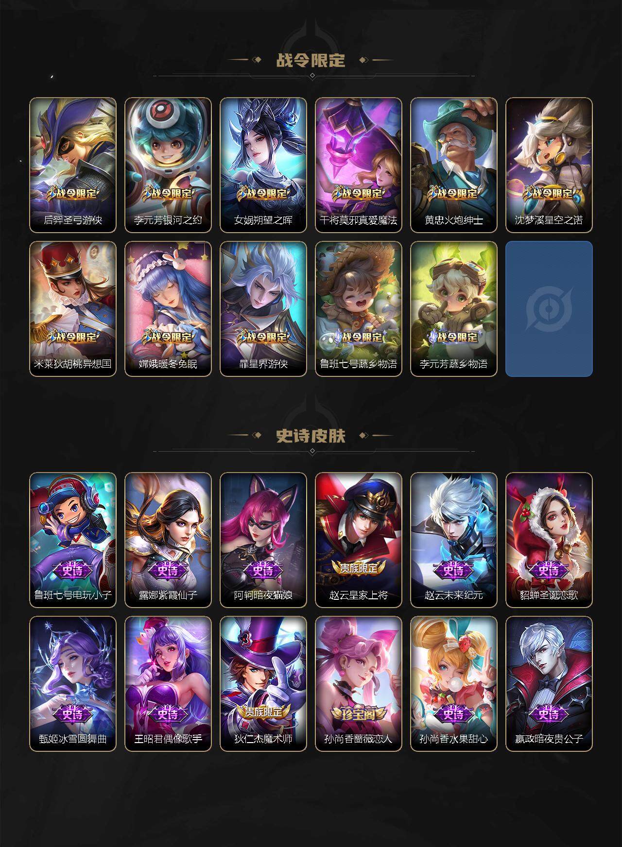 【战令限定】:墨子神迹守卫,芈月幻夜卜梦,元歌云间偶戏,达摩星际陆战队,老夫子航海奇遇记,亚瑟潮玩骑士王,后羿圣弓游侠,李元芳银河之约,女娲朔望之晖,干将莫邪真爱魔法,黄忠火炮绅士,沈梦溪星空之诺,米莱狄胡桃异想国,嫦娥暖冬兔眠,暃星界游侠,鲁班七号蔬乡物语,李元芳蔬乡物语