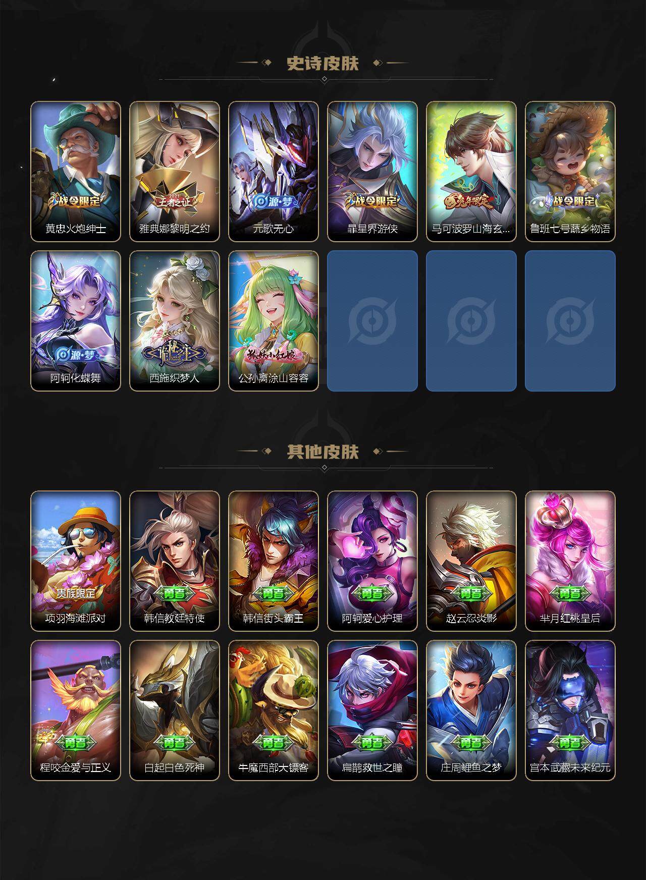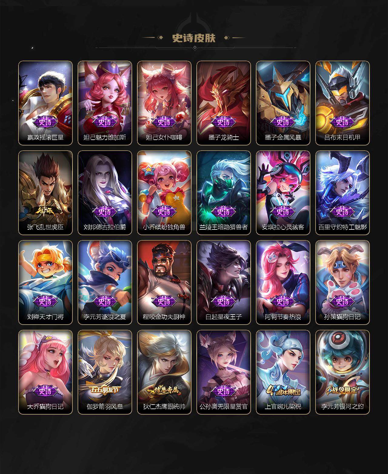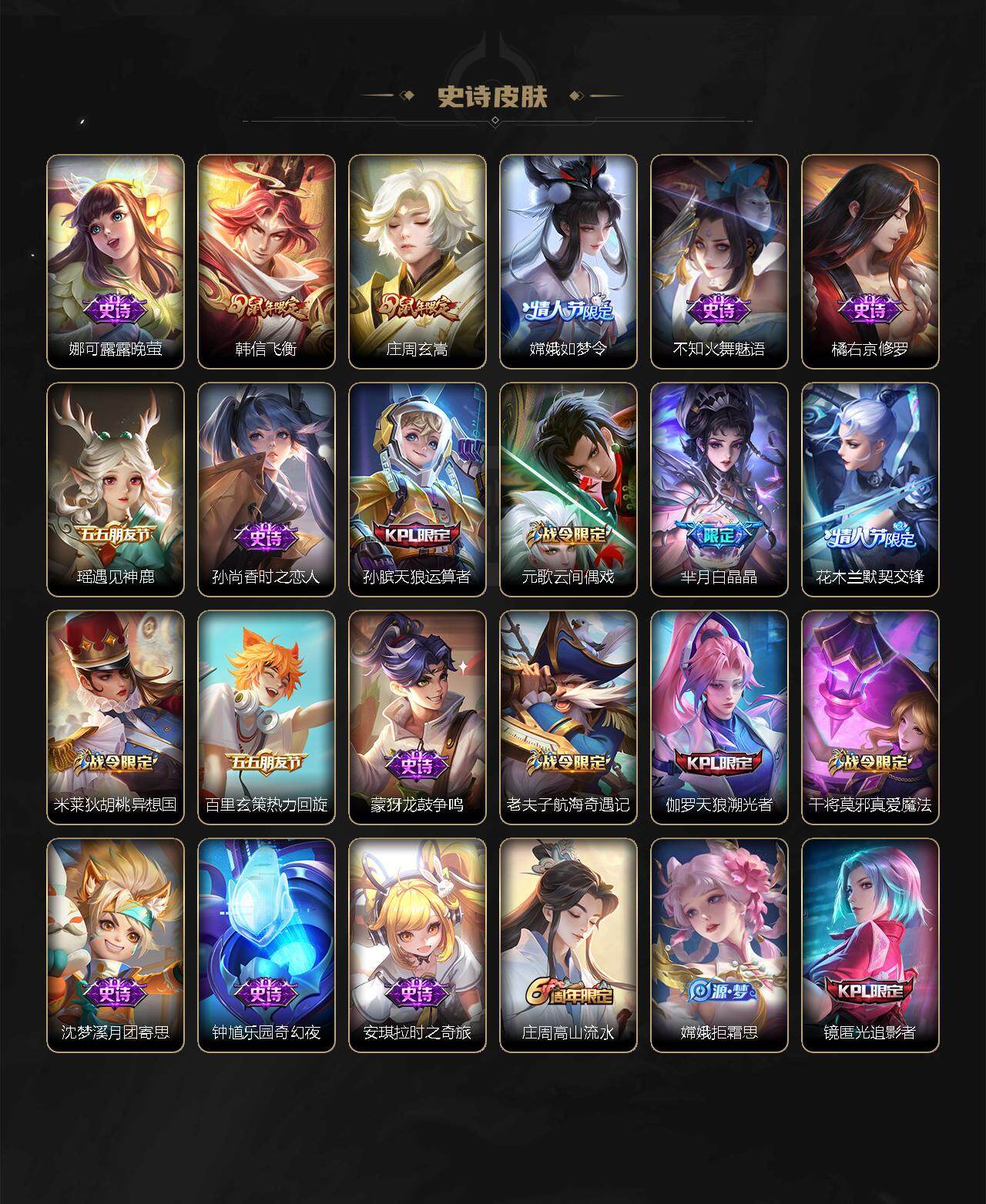 【史诗皮肤】:鲁班七号电玩小子,露娜紫霞仙子,阿轲暗夜猫娘,赵云皇家