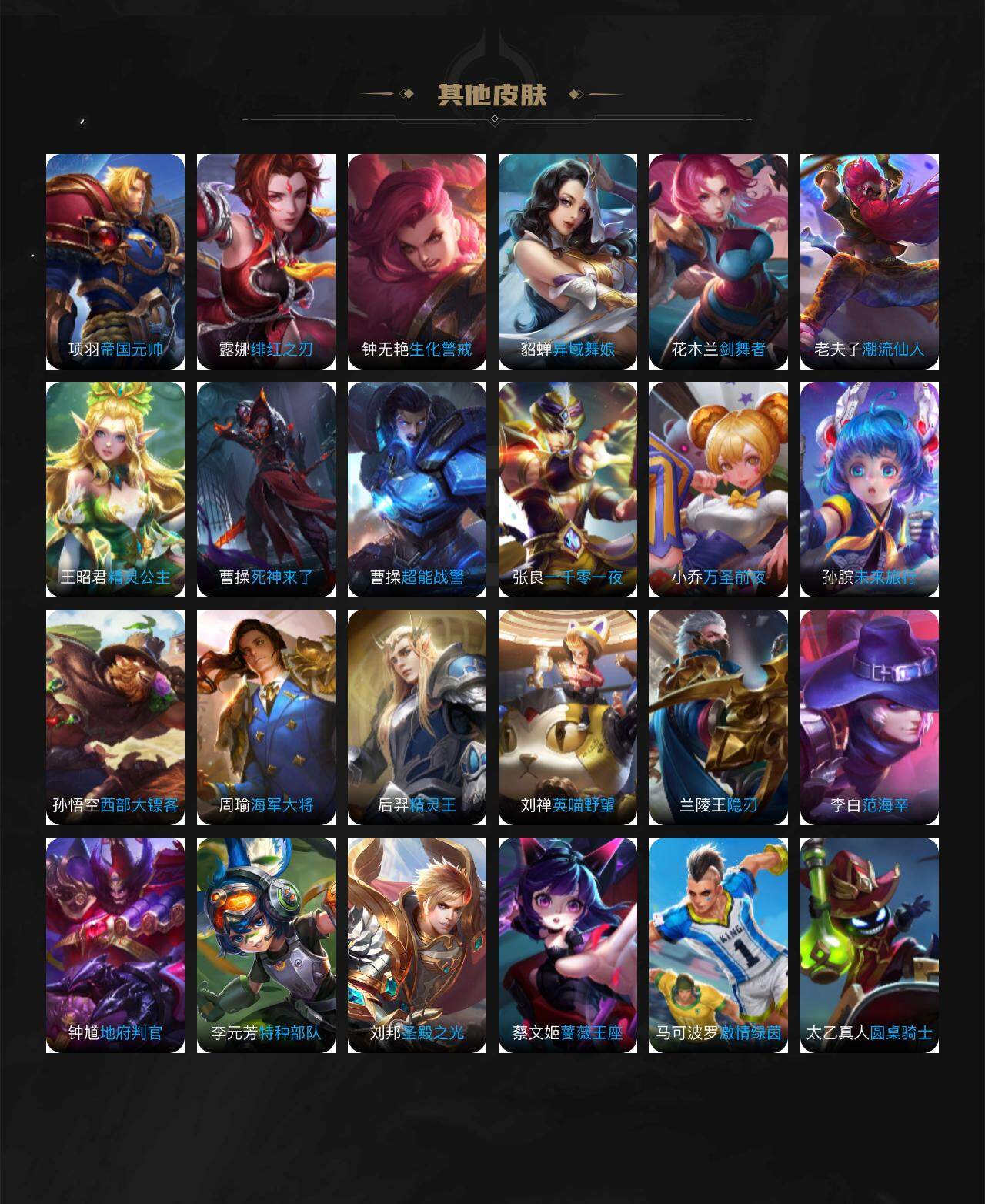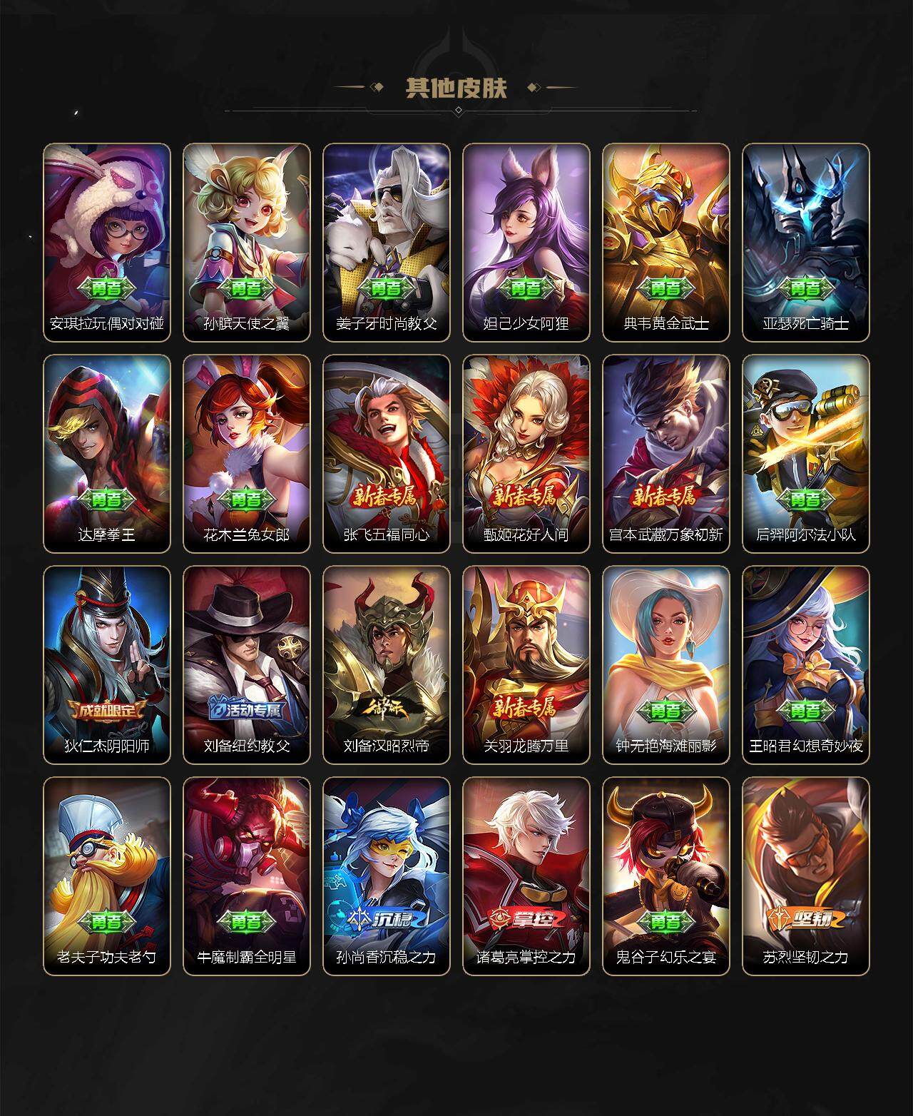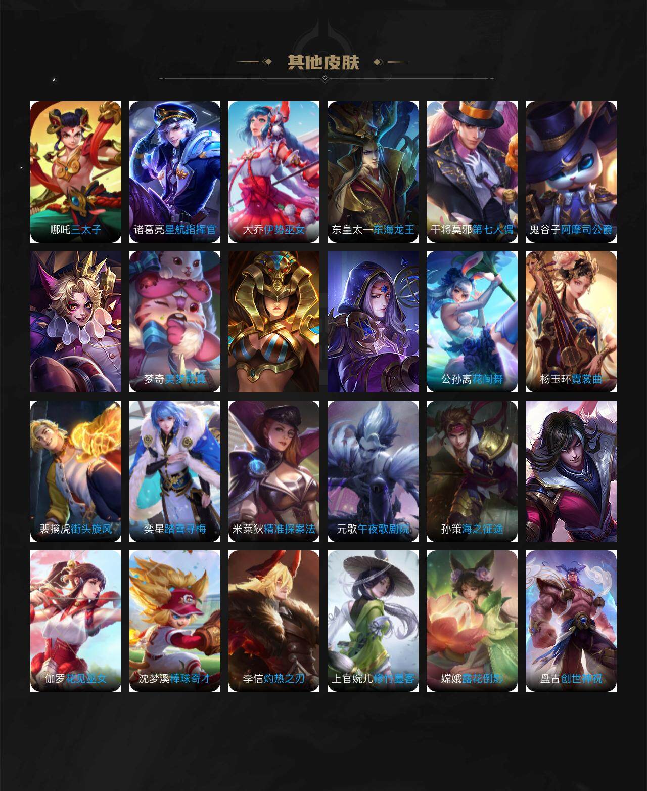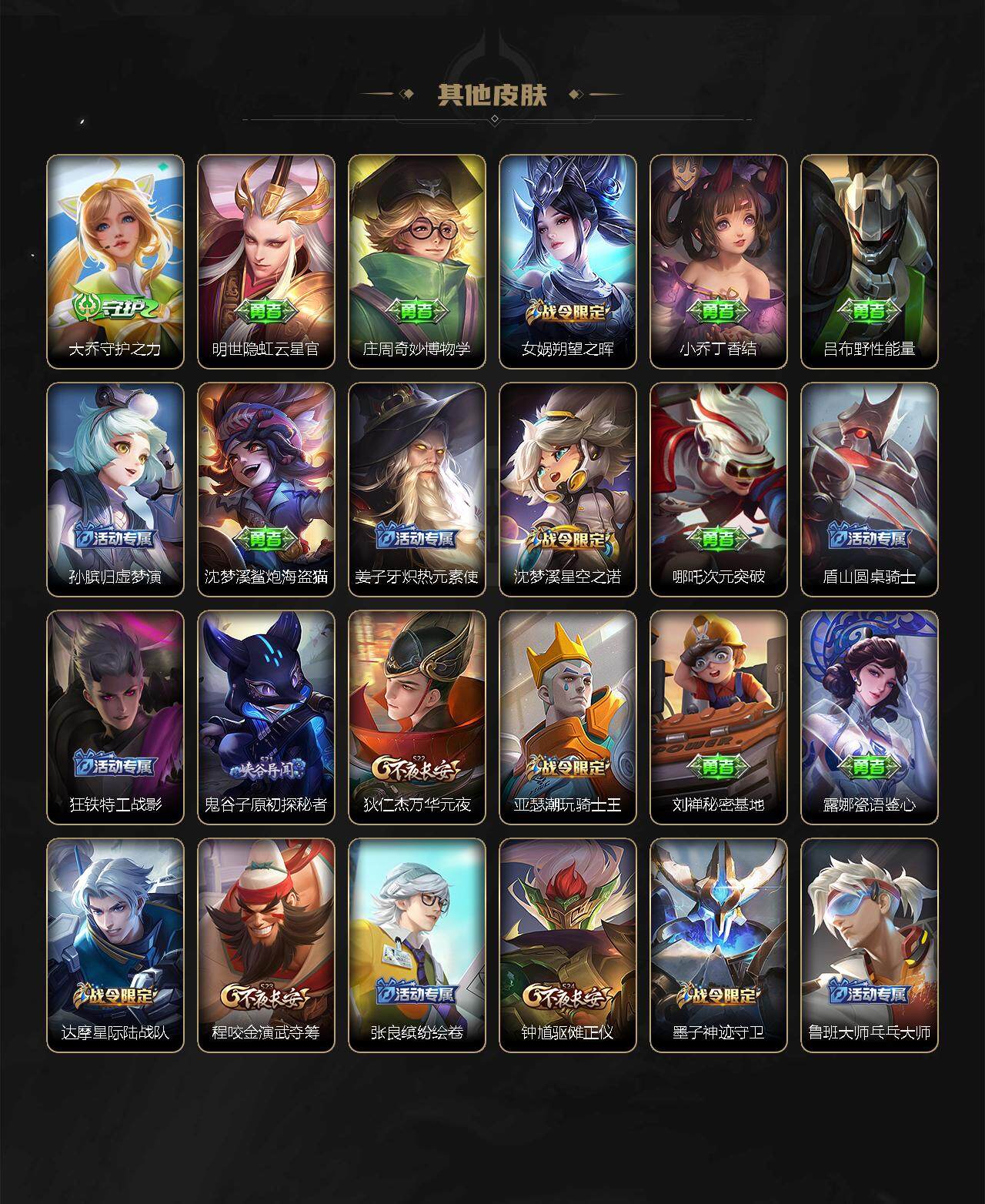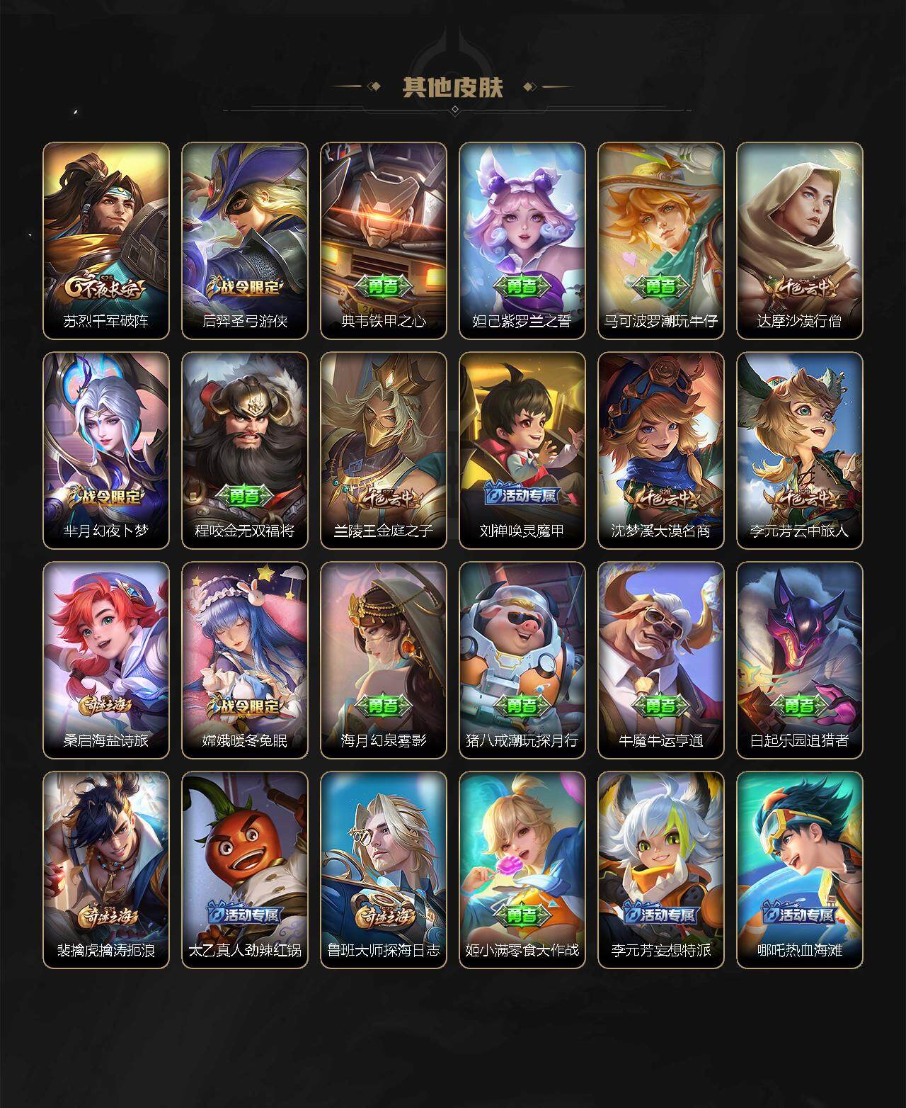 瑶遇见神鹿,娜可露露晚萤,伽罗箭羽风息,李元芳逐浪之夏,不知火舞魅语,公孙离无限星赏官,大乔猫狗日记,孙策猫狗日记,阿轲节奏热浪,露娜紫霞仙子,王昭君偶像歌手,孙尚香时之恋人,阿轲暗夜猫娘,吕布末日机甲,鲁班七号电玩小子,蒙犽龙鼓争鸣,橘右京修罗,墨子龙骑士,嬴政摇滚巨星,刘禅天才门将,白起星夜王子,安琪拉心灵骇客,安琪拉时之奇旅,程咬金功夫厨神,刘邦德古拉伯爵,兰陵王暗隐猎兽者,钟馗乐园奇幻夜,小乔缤纷独角兽,百里玄策热力回旋,墨子金属风暴,貂蝉圣诞恋歌,百里守约特工魅影,嬴政暗夜贵公子,嫦娥拒霜思,雅典娜黎明之约