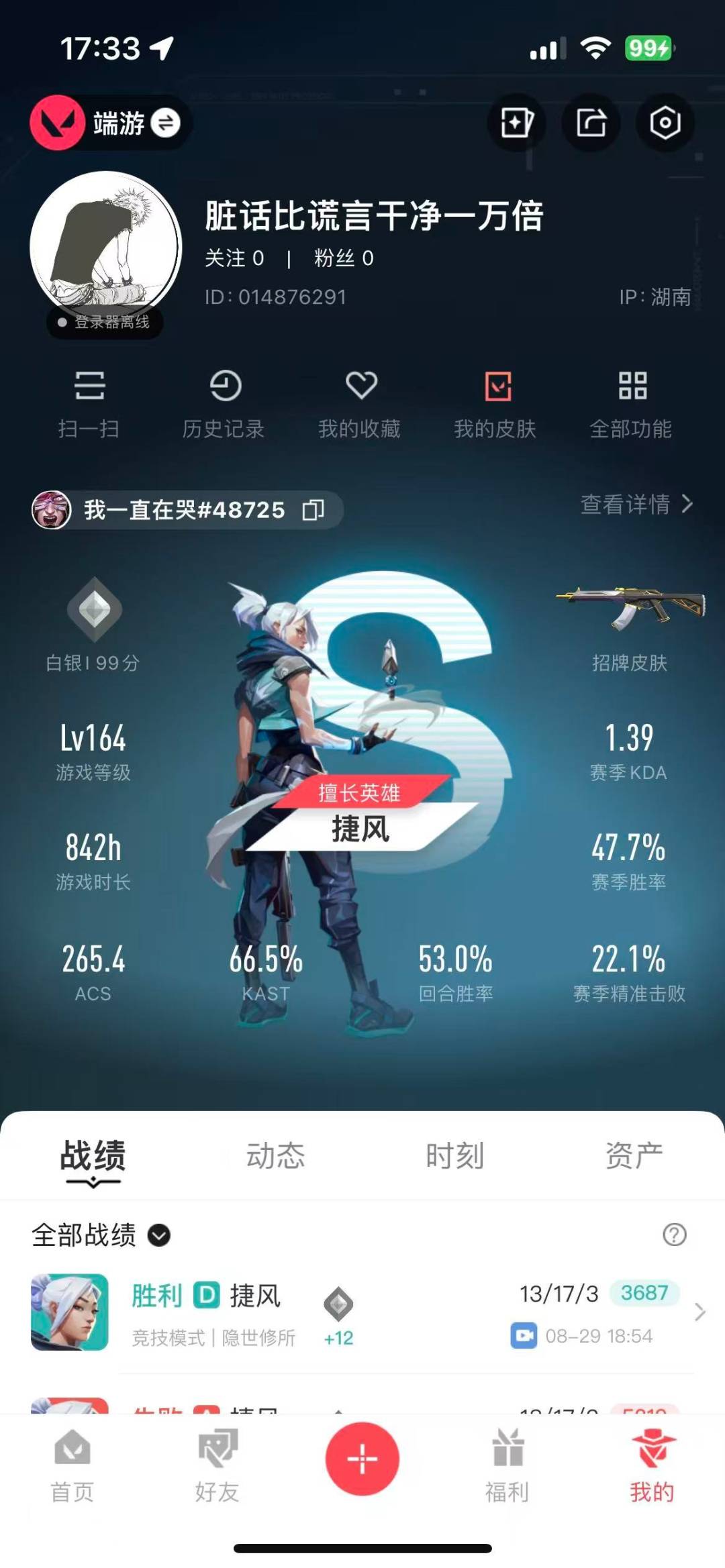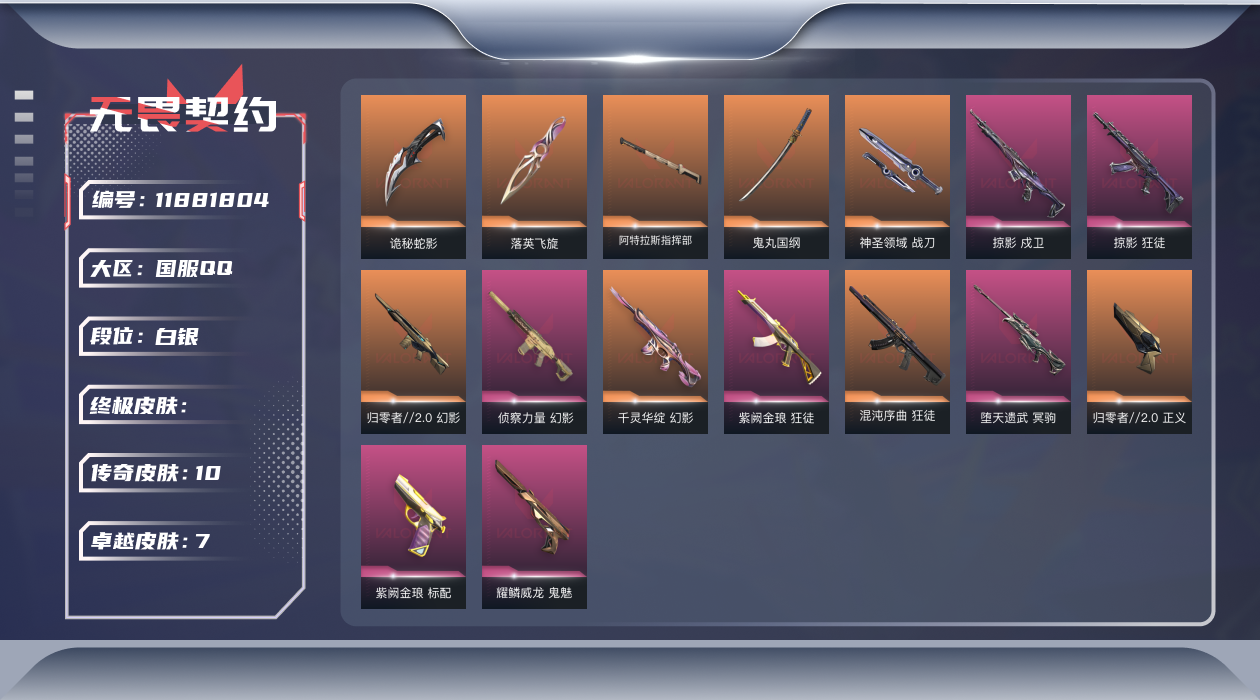 [11881804]10橙皮 7紫皮 65皮肤 27英雄 98卡面 875已用源晶 白银 优质装备:幻影-千灵华绽,狂徒-混沌序曲,狂徒-掠影,狂徒-紫阙金琅,幻影-侦察力量,冥驹-堕天遗武,戍卫-掠影,标配-紫阙金琅,落英飞旋,鬼丸国纲,神圣领域 战刀,诡秘蛇影,阿特拉斯指挥部,鬼魅-耀鳞威龙 佩枪皮肤:正义-归零者//2.0 步枪皮肤:幻影-归零者//2.0