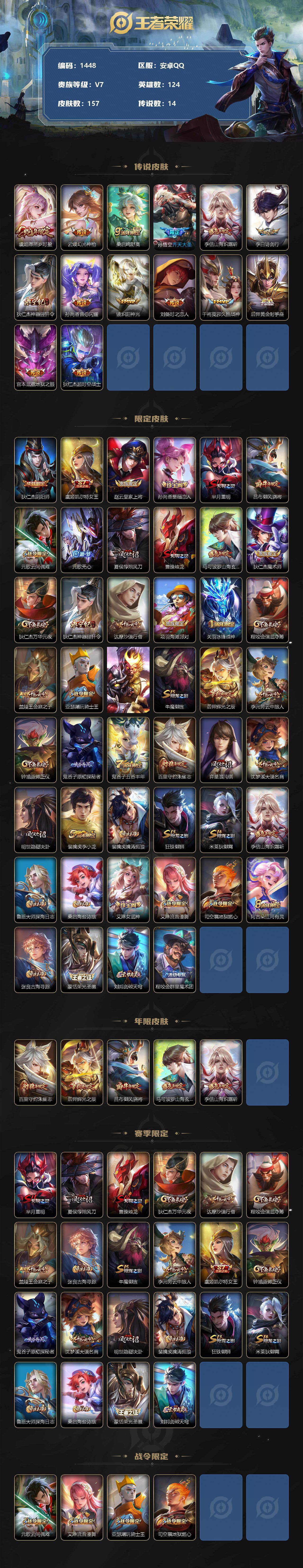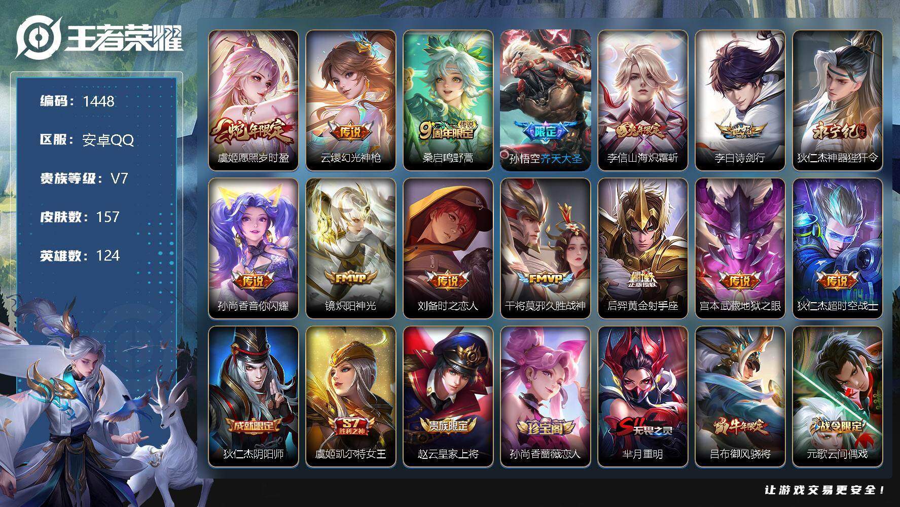 [12071312]【商品标题】:安卓Q-V1-最强王者段位-124英雄-157皮肤-0典藏-0珍品无双-0无双-0珍品传说-14传说-36史诗