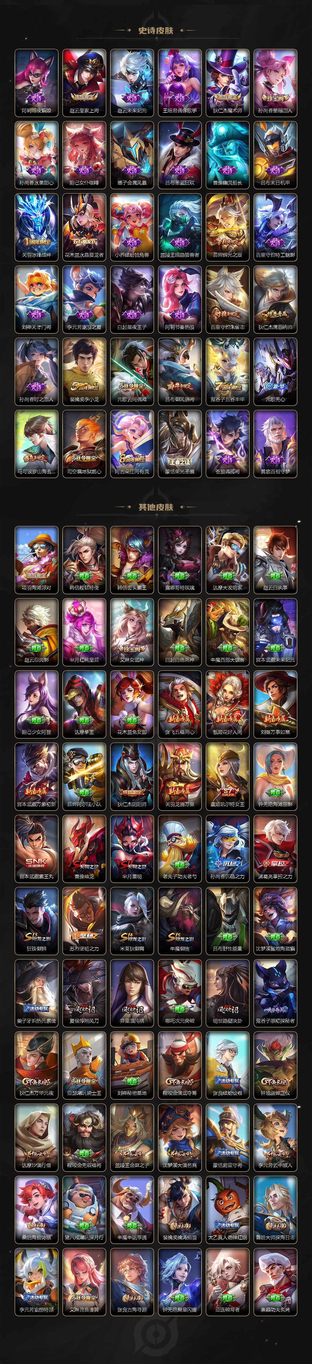 【史诗皮肤】:阿轲暗夜猫娘,赵云皇家上将,赵云未来纪元,王昭君偶像歌手,狄仁杰魔术师,孙尚香蔷薇恋人,孙尚香水果甜心,妲己女仆咖啡,墨子金属风暴,吕布圣诞狂欢,曹操幽灵船长,吕布末日机甲,关羽冰锋战神,花木兰水晶猎龙者,小乔缤纷独角兽,兰陵王暗隐猎兽者,后羿辉光之辰,百里守约特工魅影,刘禅天才门将,李元芳逐浪之夏,白起星夜王子,阿轲节奏热浪,百里守约朱雀志,狄仁杰鹰眼统帅,孙尚香时之恋人,裴擒虎李小龙,元歌云间偶戏,吕布御风骁将,鬼谷子五谷丰年,元