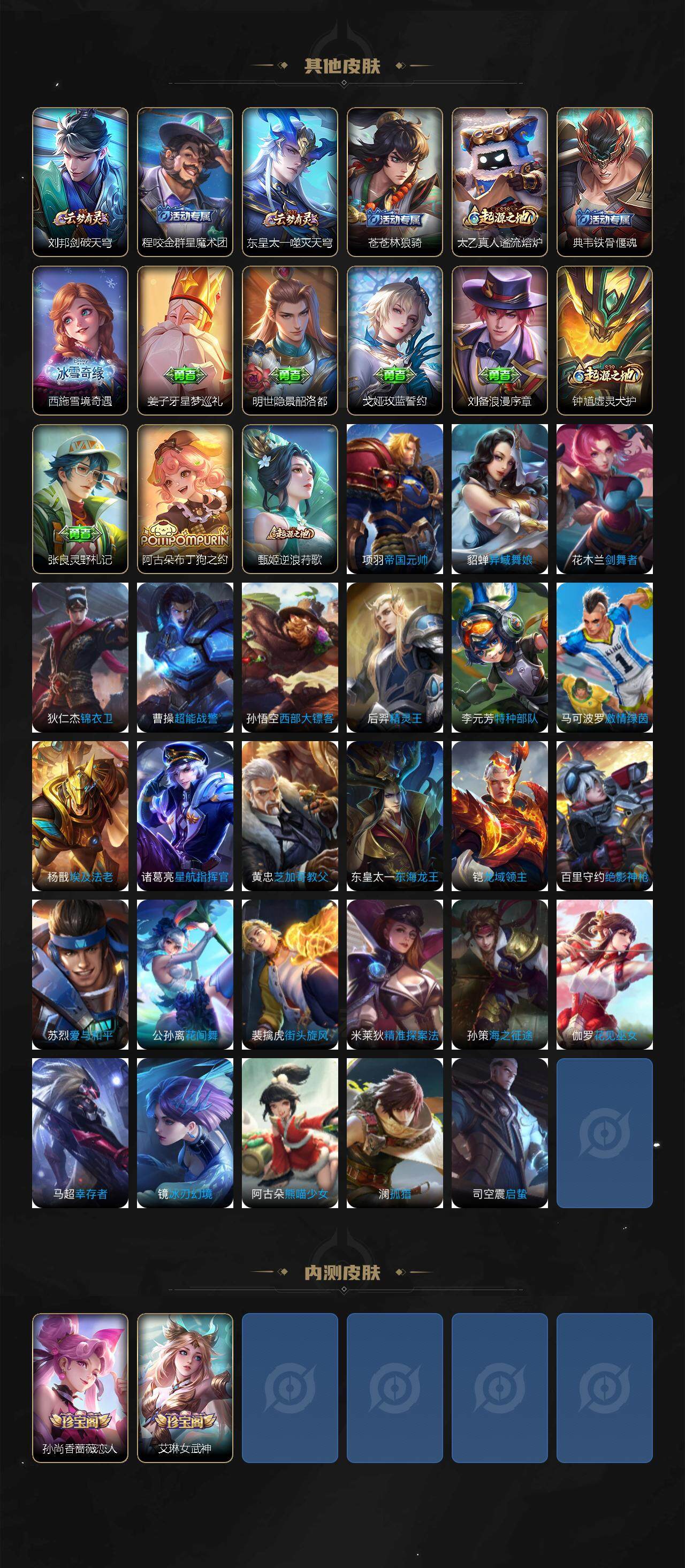 【赛季限定】:芈月重明,夏侯惇朔风刀,曹操烛龙,狄仁杰万华元夜,达摩沙漠行僧,程咬金演武夺筹,兰陵王金庭之子,张良古海寻踪,牛魔御旌,李元芳云中旅人,虞姬凯尔特女王,钟馗驱傩正仪,鬼谷子原初探秘者,弈星混沌棋,沈梦溪大漠名商,明世隐疑决卦,裴擒虎擒涛扼浪,狂铁御狮,米莱狄御霄,鲁班大师探海日志,桑启海盐诗旅,蒙恬荣光圣徽,刘邦剑破天穹